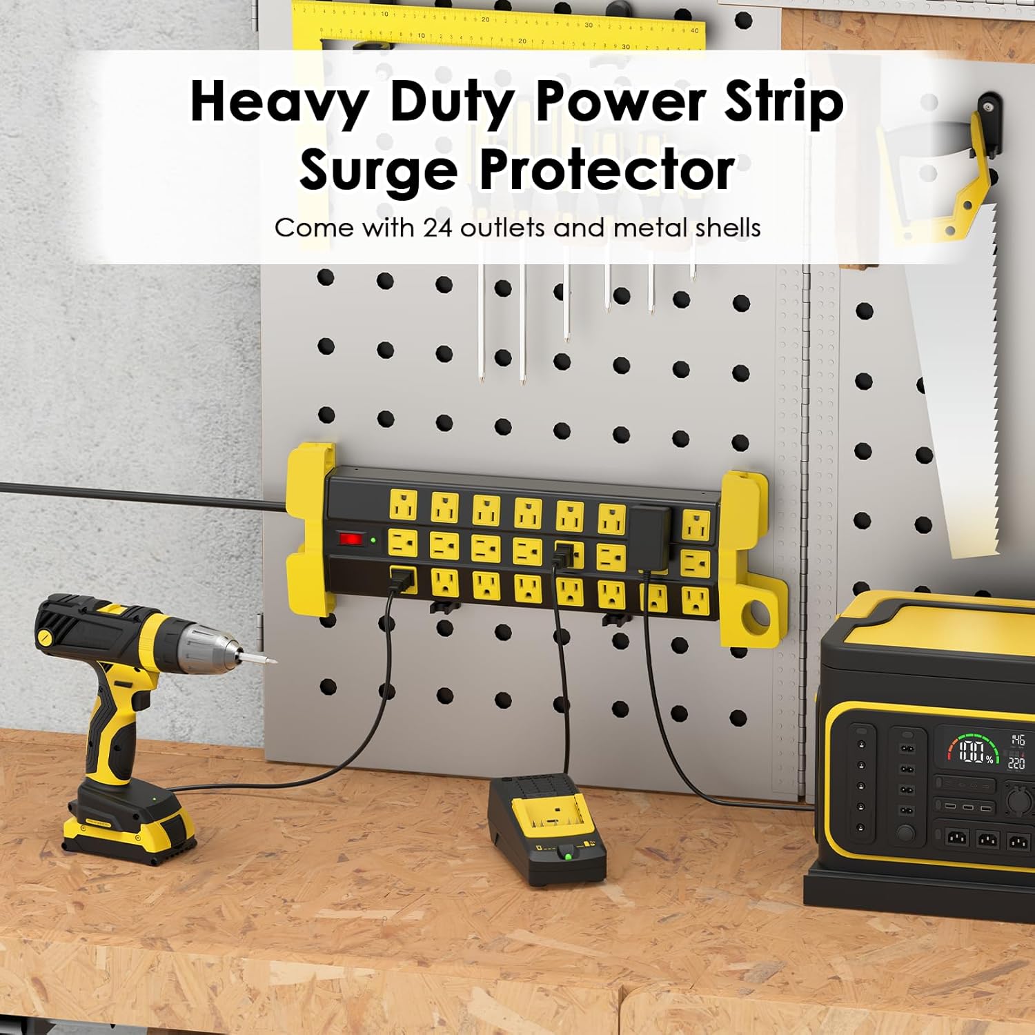 HHSOET Heavy Duty Power Strip with Surge Protection, Industrial Commercial Metal 24 Outlets Wall Mount for Garage Shop, 15 Amp, Switch, 6FT Extension Cord, Black.
