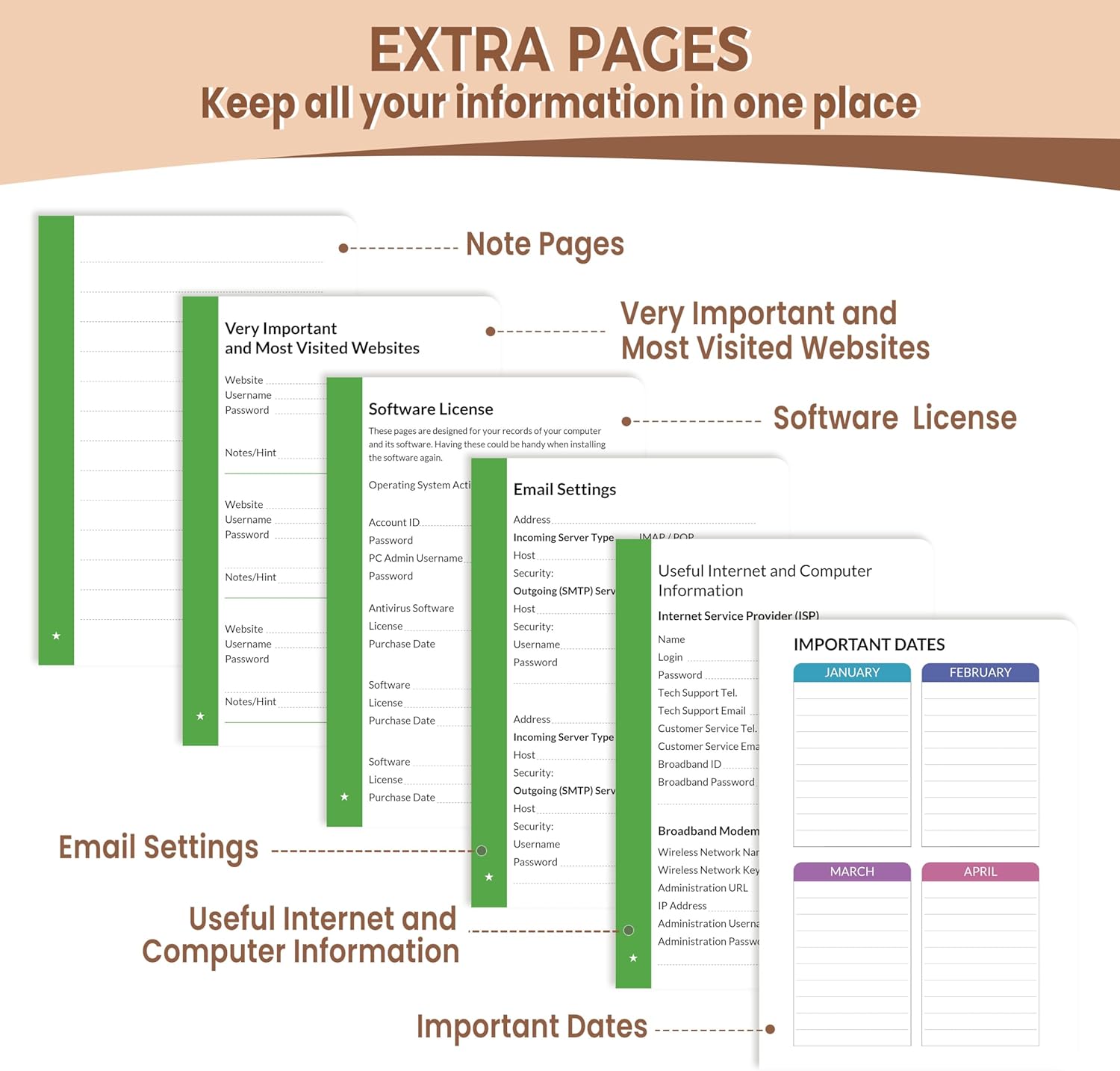 - AMPLE WRITING SPACE: This password log has 160 pages and can store up to 576 passwords. Each password entry has three lines and a colored divider for easy organization. In addition, you can record your important dates, Internet service provider, wireless router settings, Email settings, software licenses, most visited websites, and other notes.