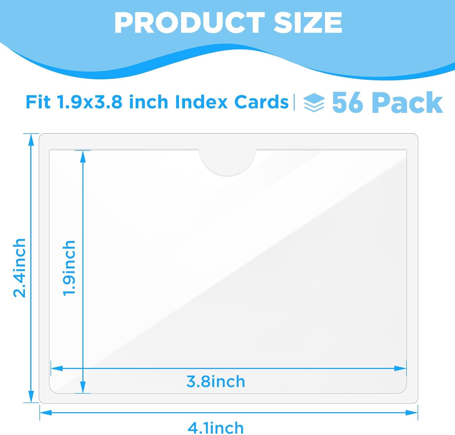 56 Pack Clear Self-Adhesive Pockets, 1.9" x 3.8" Index Card Pockets With Top Open Loading, PVC Label Holders for Organizing storage bins, Library Card, Drawer, and Protecting Your Cards