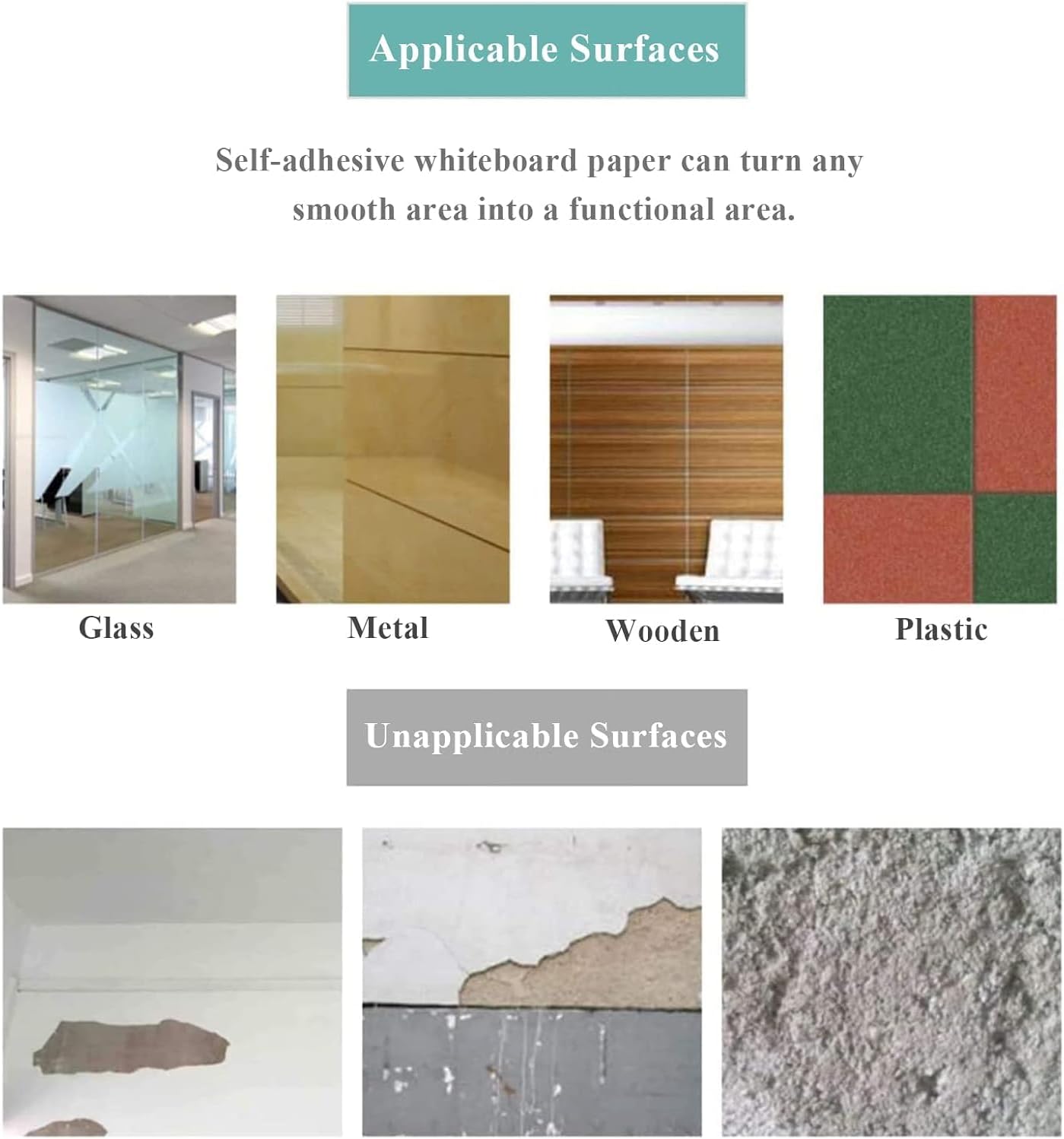 - {SELF-ADHESIVE BACKING}: The back of the whiteboard sticker is with adhesive, dry erase contact paper peel and stick, without the help of nails, just find a smooth surface, such as walls, desktops, cabinets, etc., peel off the back of the paper, adjust the orientation angle, lightly stick to the wall, you will get a perfect writable and smooth whiteboard wall.