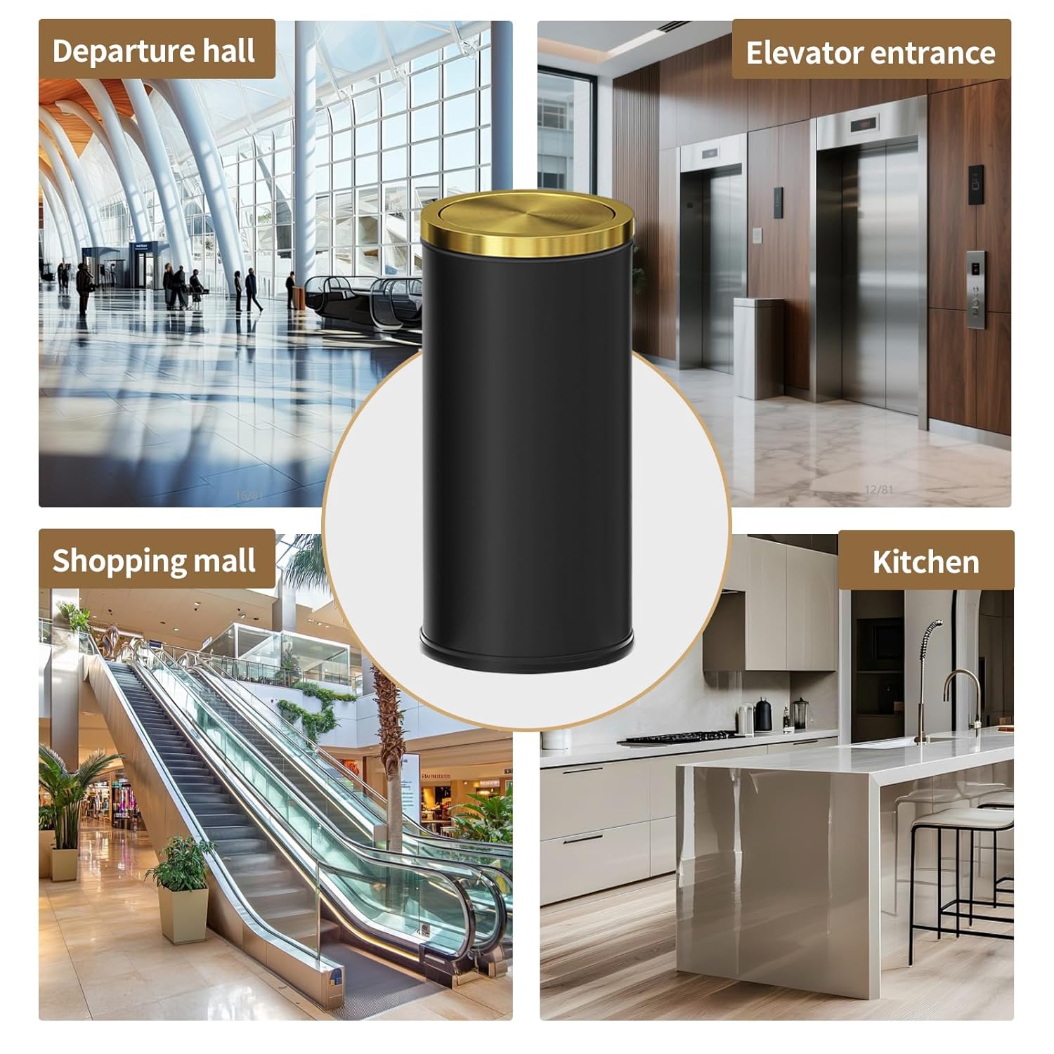 Brushed Gold Kitchen Trash Can with Swing Lid 7.8Gallon,Stainess Steel Commercial Garbage Can Wastebaskets for Shopping mall,Hotel Lobby,Airport, Alevator Using (Black with gold lid, 7.8 gallon)