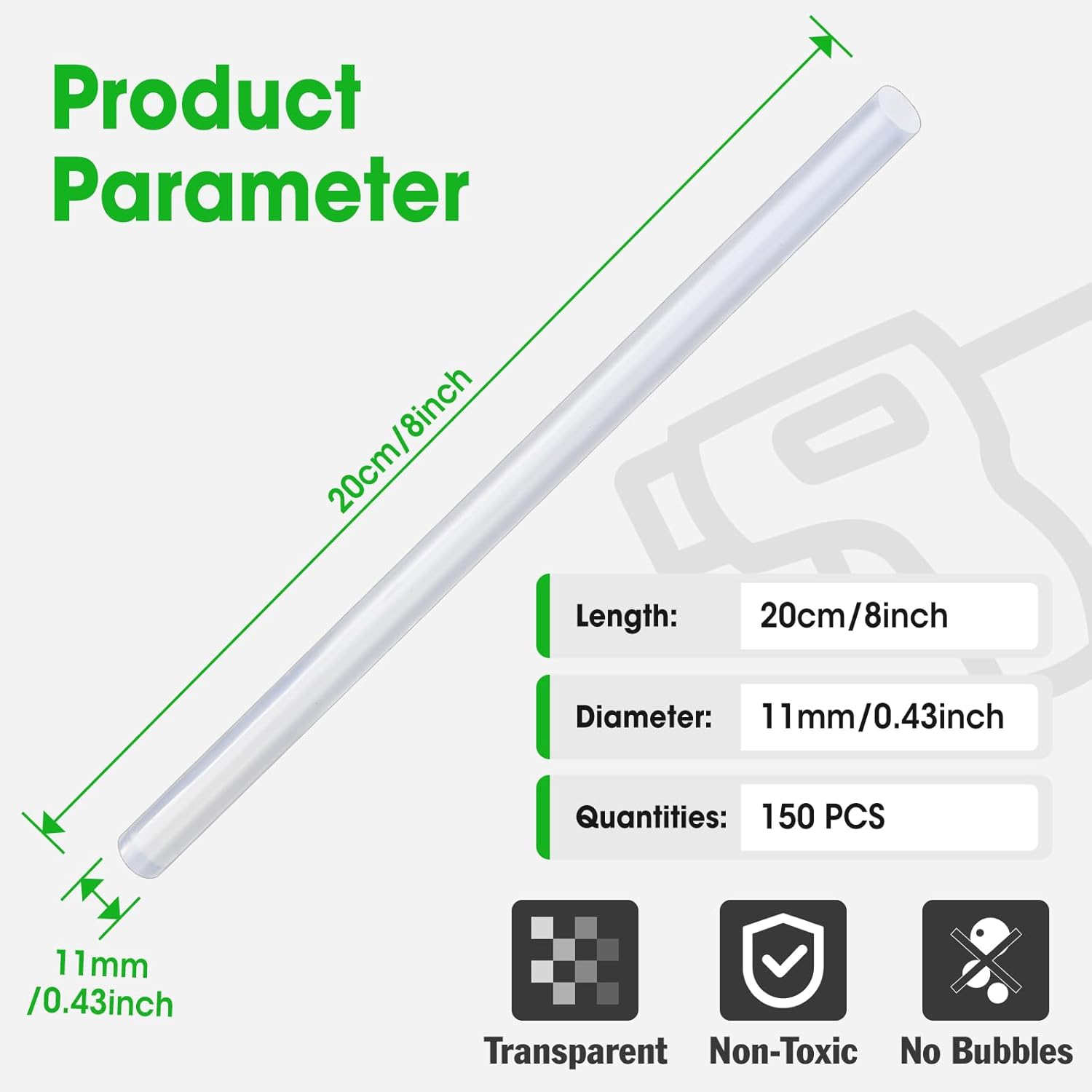 - Value Package: amazing set of 150 glue gun sticks, 8" long x 0.43" diameter, designed to fit all full size glue guns.