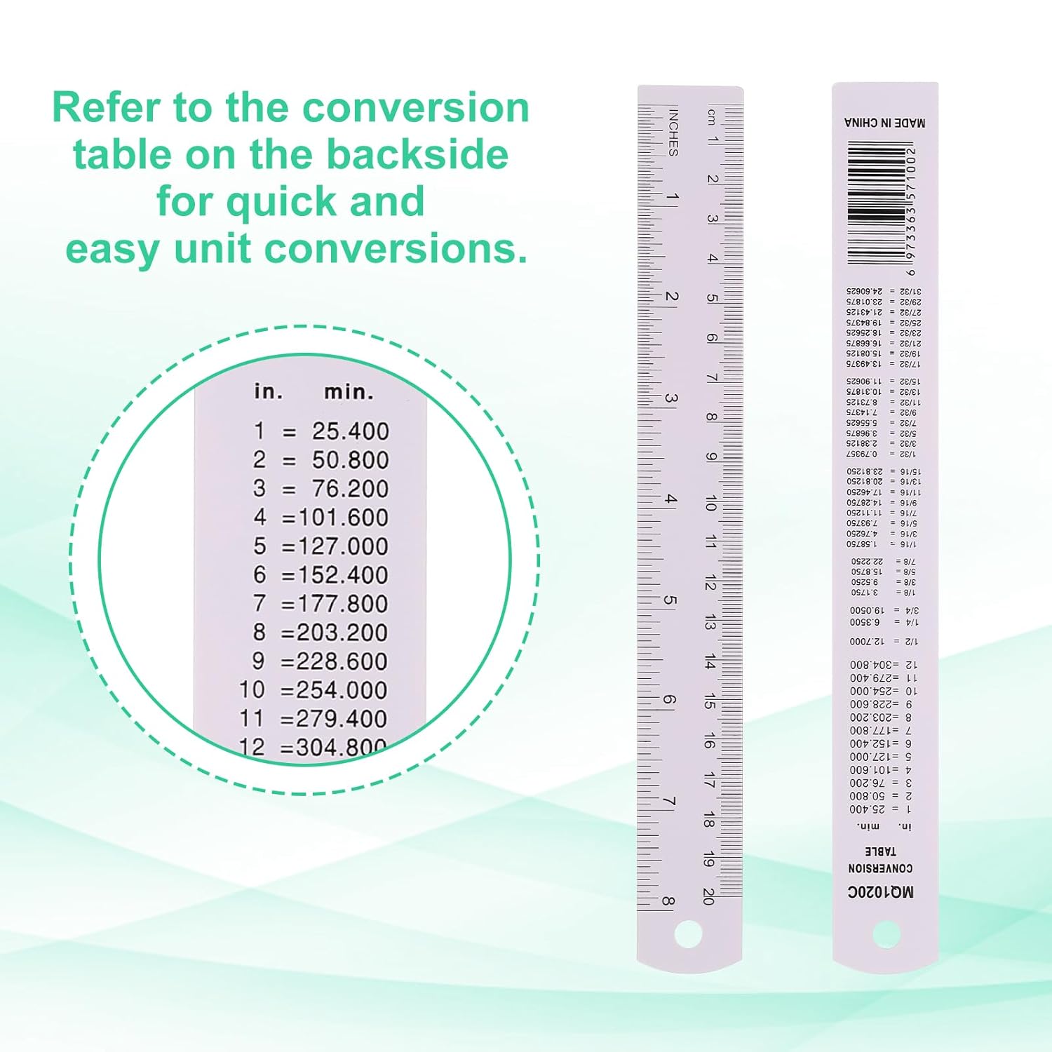 - Instruction: Use the ruler for precise measurements and calculations in both inches and centimeters. Refer to the conversion table on the backside for quick and easy unit conversion. Hang the ruler using the provided hole for convenient storage and accessibility.
