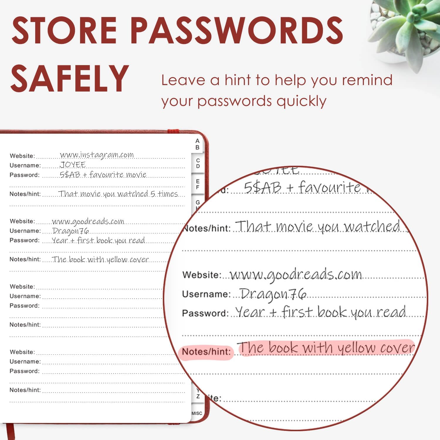 - ANONYMOUS WITHOUT ANY TITLE: On the outside, this password notebook organizer looks just like those writing journals, there is no title listed on the cover, so no one would know it's a password book. But we still recommend keeping the internet password logbook in a safe place such as a locked drawer or a shelf full of books.