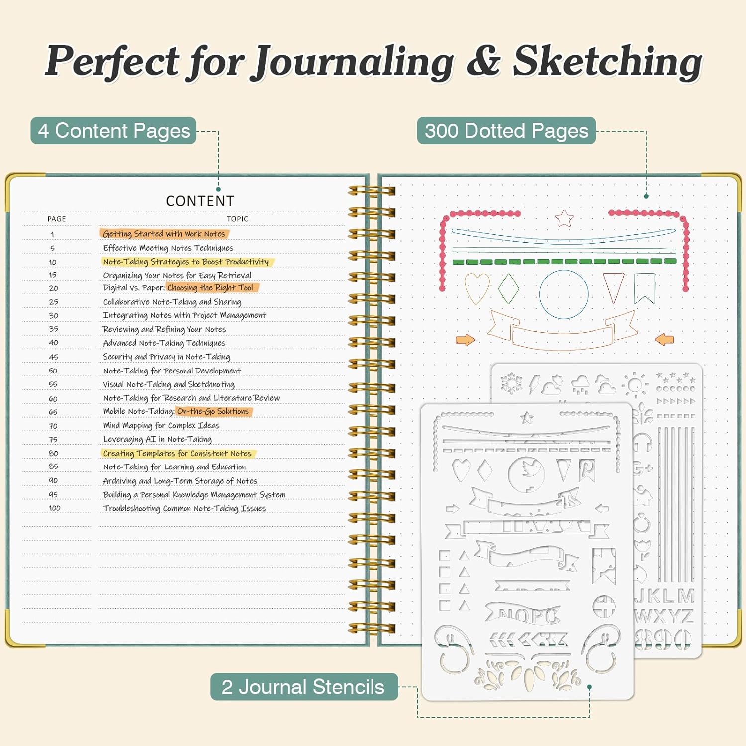 - 【Thoughtful Dot Grid Journal Notebook】Bullet Journaling notebook includes an elastic closure band to keep it securely closed and features an expandable back pocket for storing loose notes or cards. Additionally, it comes with 24 colorful tabbed stickers for easy sectioning and note classification, perfect for school, office, home, work organization, college, business, adults. Additionally it comes with 2 journal stencils for DIY your journaling.
