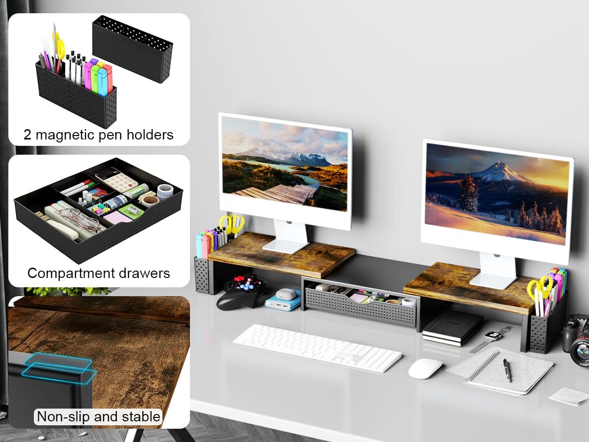 Spacrea Metal Desk Organizers and Accessories, Dual Monitor Stand Riser with Drawer and 2 Pen Holders, Desk Accessories & Workspace Desktop Organizers for Office Supplies (Wood)