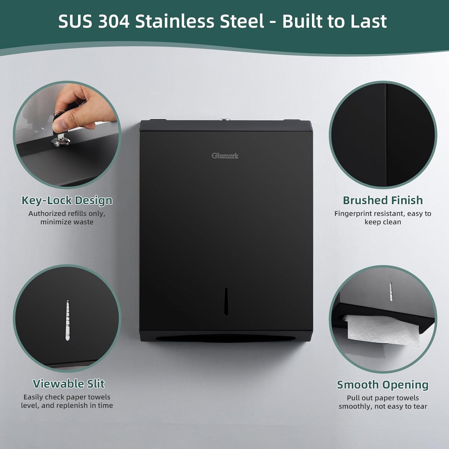 Paper Towels Dispenser Wall Mounted with Key Lock, Multifold C Fold Trifold Hand Towel Dispenser, Stainless Steel Tissue Holder Large Capacity Elegant for Bathroom Commercial, Black