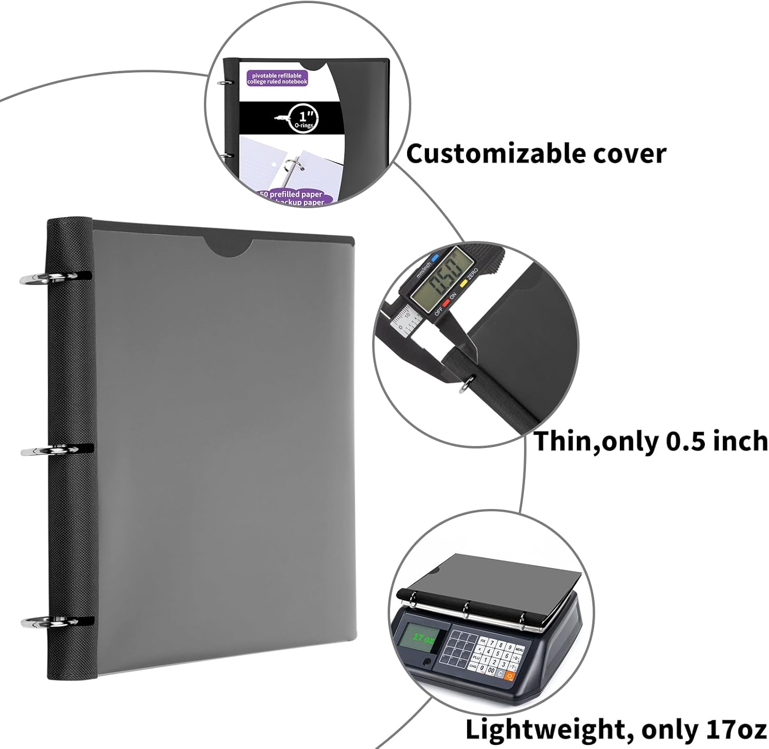 2 Pcs Pivotable Refillable Notebook, Upgraded 1 Inch 3 Ring Notebook Binder, 100 College Ruled Paper, 5 Subject Notebook with Dividers and Folder Pockets, Tabs- Black
