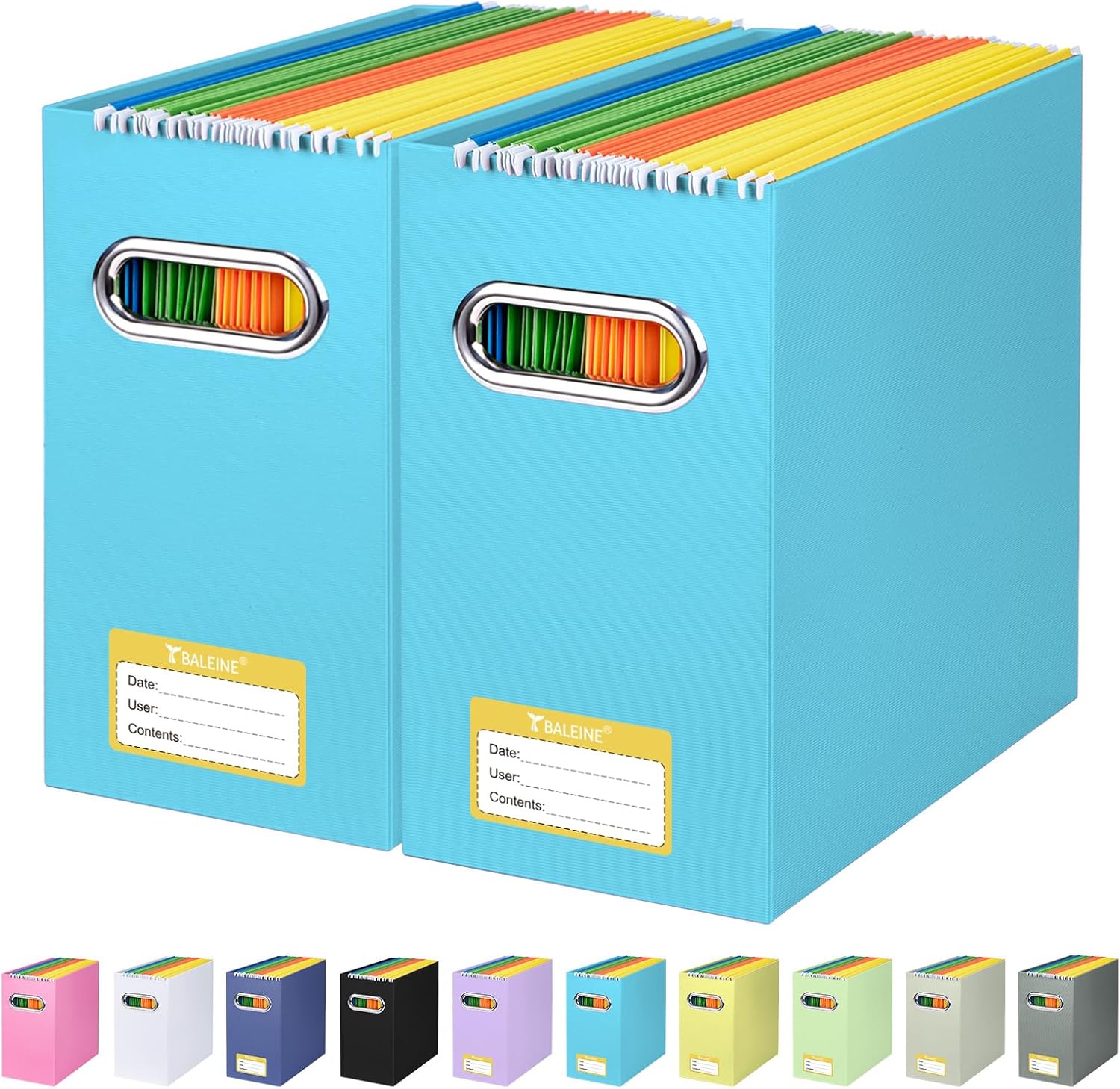 BALEINE File Organizer Box, Cardboard File Folder Organizer with Handle for Letter Size, Portable Collapsible Hanging Filing Box for Home Office Document Storage (2 Pack, Blue)