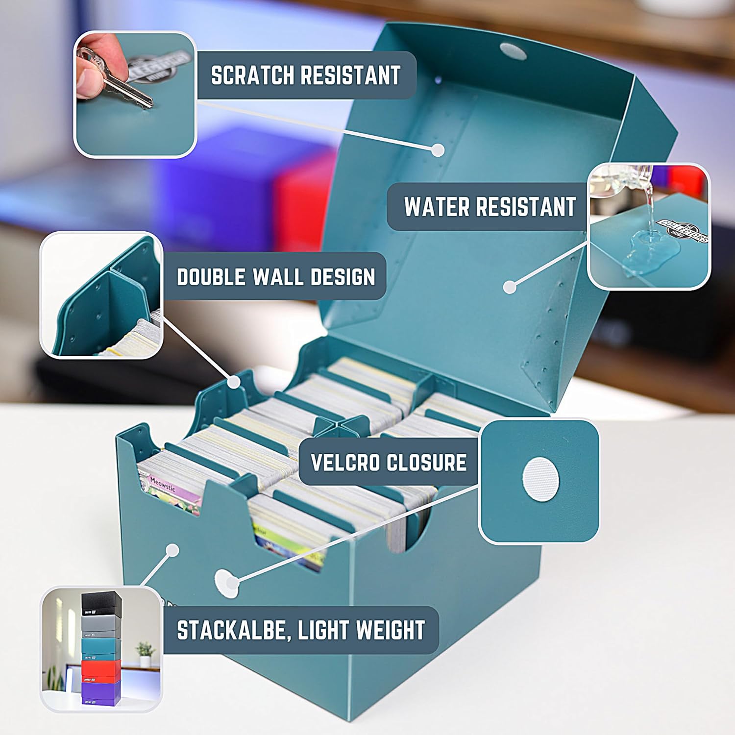 - MORE FEATURES, MORE PEACE OF MIND: This Card Storage Deck Box is built for convenience and protection. Lightweight and stackable, it's easy to store or transport without taking up extra space. The scratch-resistant and water-proof design keeps your cards safe from water damage. A secure VELCRO CLOSURE ensures your collection stays intact, while the opaque material adds an extra layer of UV protection—keeping your cards in pristine condition, inside and out.