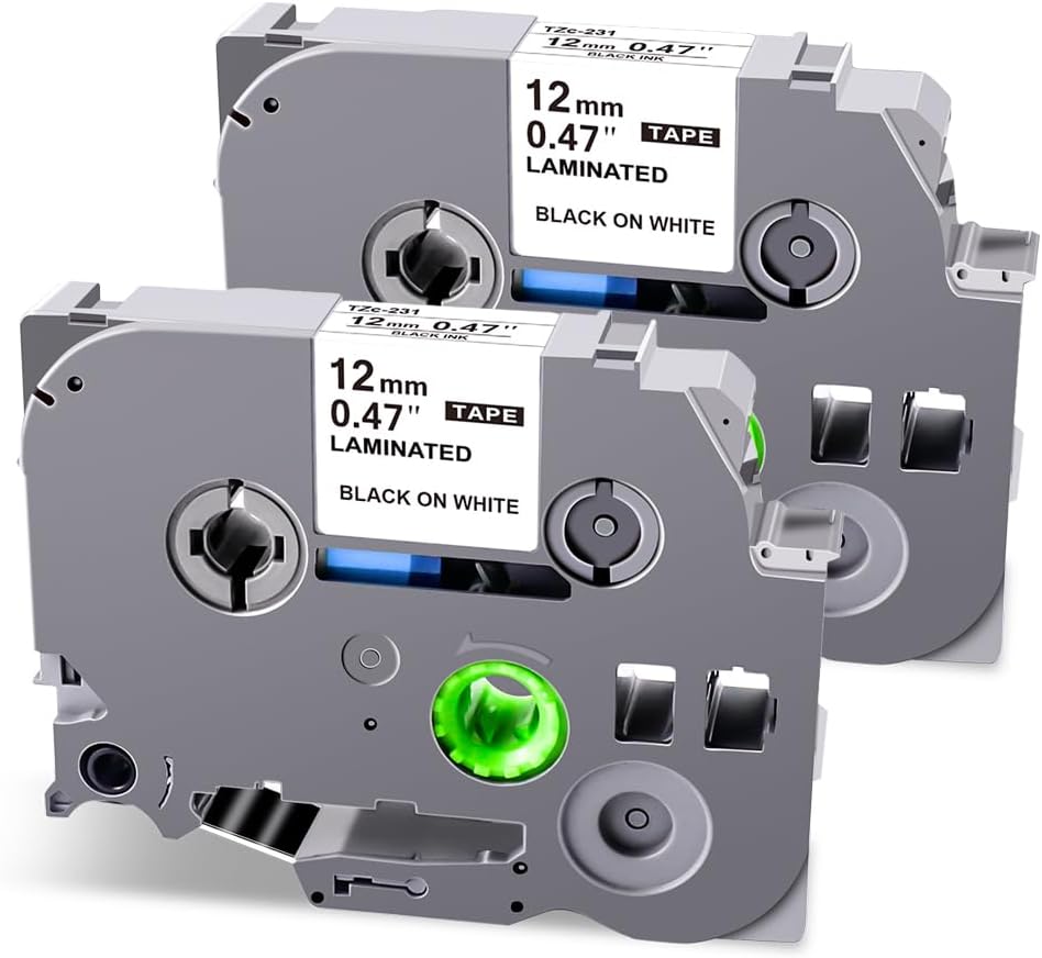 UNOKA Ptouch Tape 12mm 0.47 White Laminated Compatible with Brother Label Maker PTH110 PTD220 PTD210, TZe TZ Tape TZe-231 Black Ink on White Refills, Waterproof, Indoor/Outdoor Use, 2 Pack