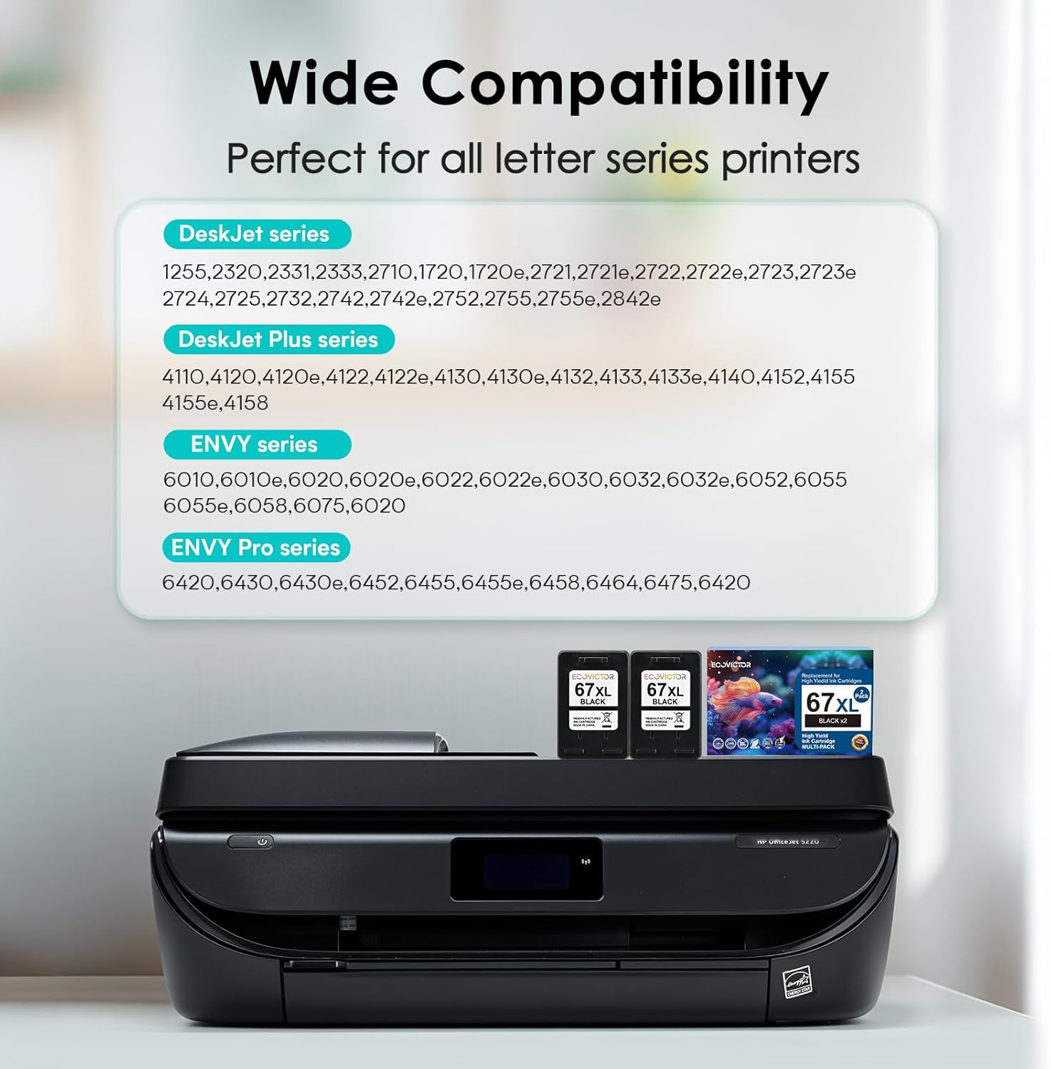 - Long-Lasting Page Yield: EcoVictor 67xl black ink cartridge for hp 67 black ink cartridge prints up to 650 pages each (at 5% coverage). EcoVictor for hp 67 ink cartridges black is perfect for home, school, or office use. Enjoy long-lasting printing performance without the hassle of frequent replacements.