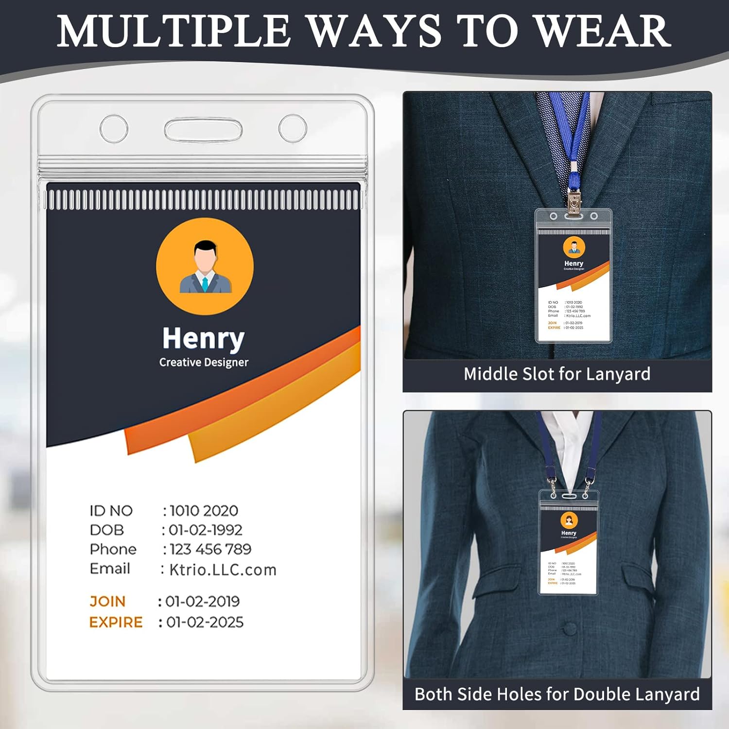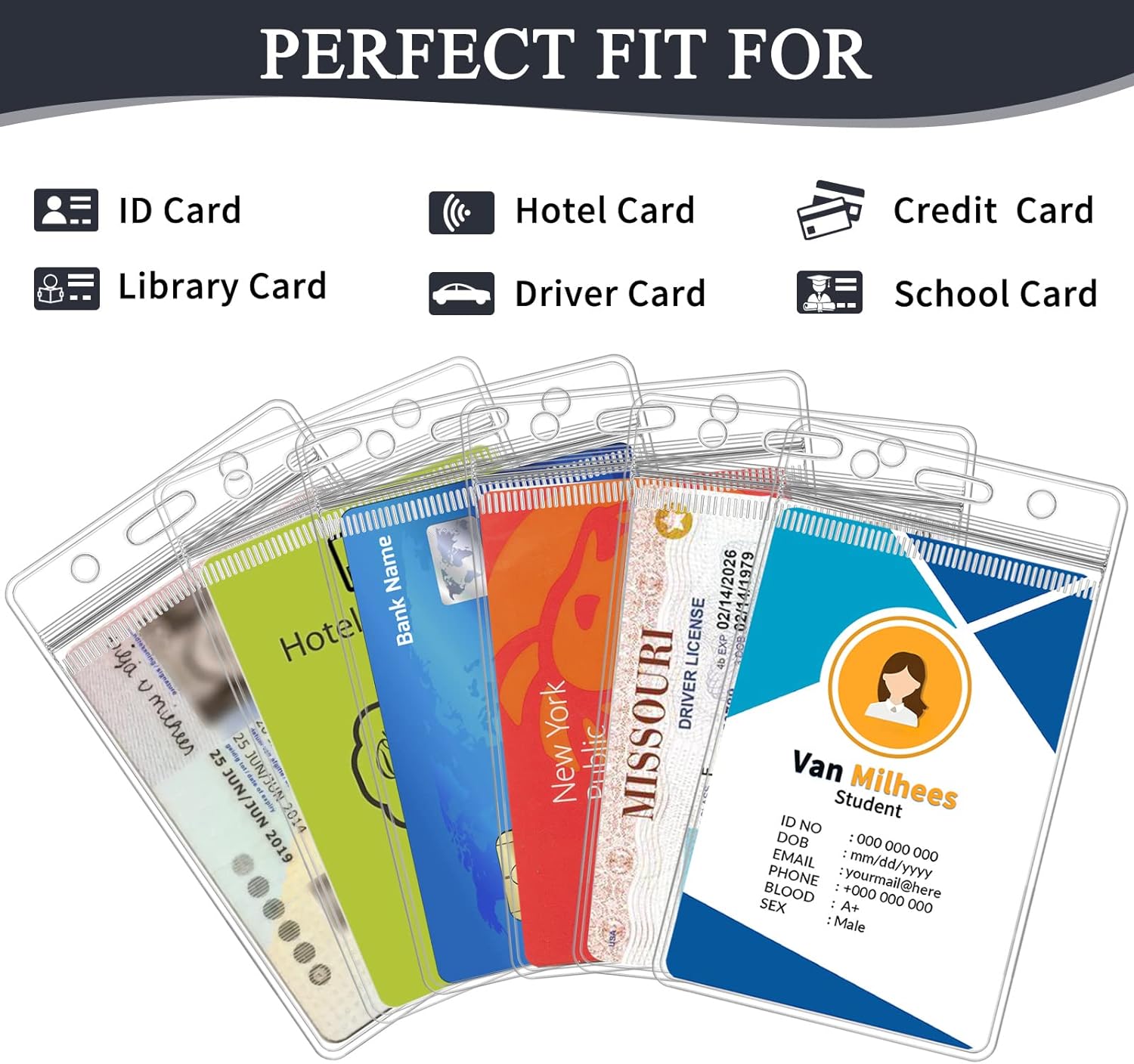 - Waterproof & Dust-proof - Our plastic name tag ID holder is made of quality PVC material, which is durable, not easy to wear, with resealable zipper closure and 2 convex points. Good sealing can prevent water or dust from entering, keeping cards dry and clean. You can safely put your ID card, work card, traffic pass, or credit card in it.