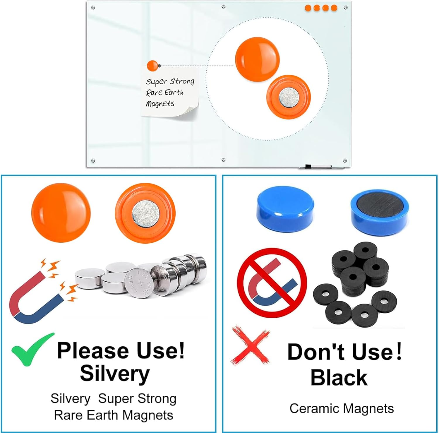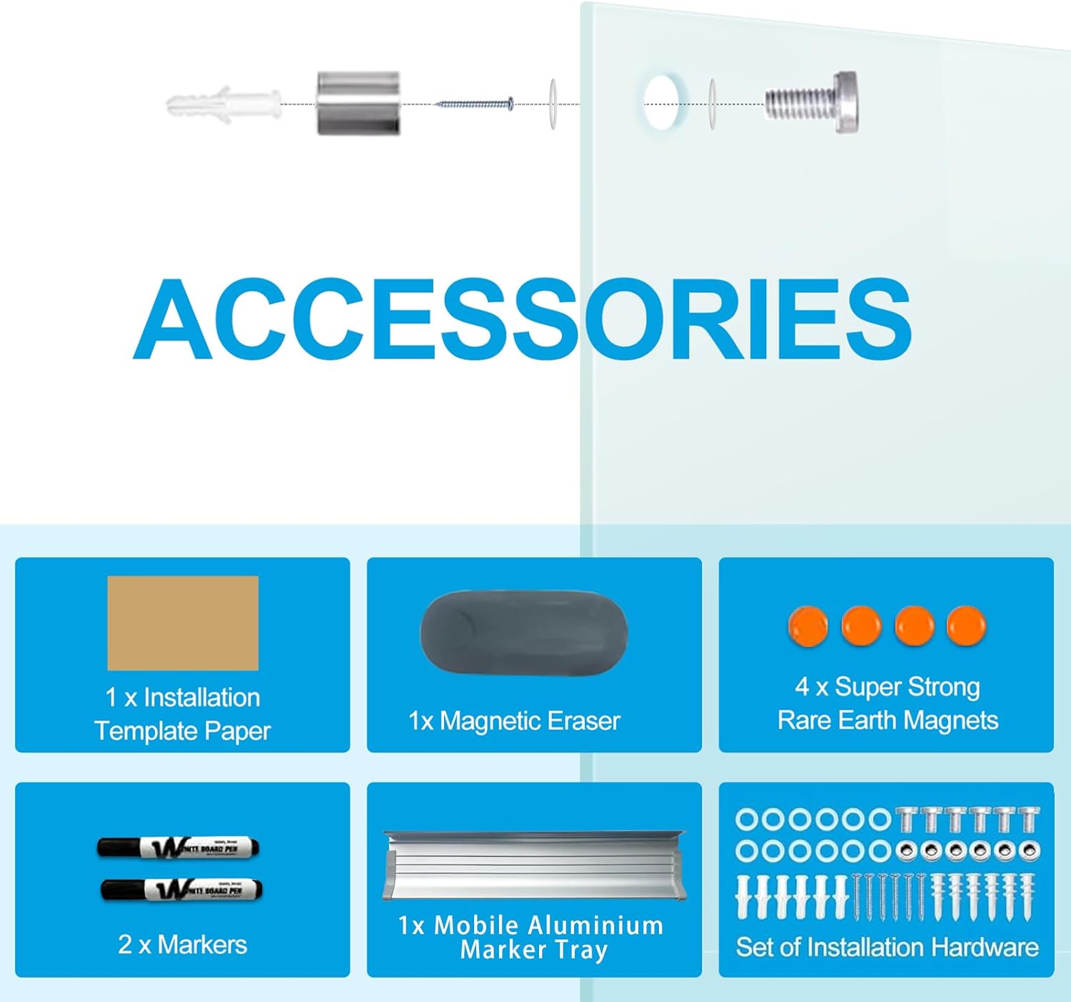 - COMPREHENSIVE ACCESSORIES SET: Comes with one 72" x 36" frameless tempered glass whiteboard, two markers, four magnets, one eraser and one marker tray for mounting. Pay special attention to the magnetism will not be strong due to the thickness of the glass, standard magnets do not work. Please use silvery super strong rare earth magnets. Don't use normal black magnet and fridge magnet.