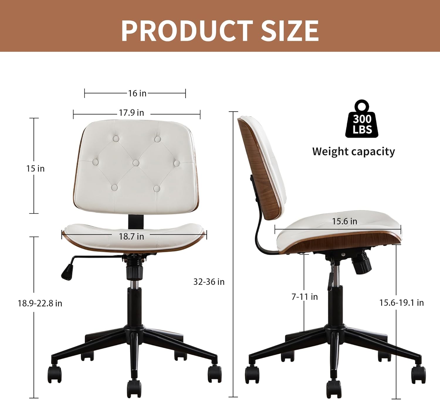 Small Home Office Chair – Adjustable Height, Armless PU Leather Mid-Back Desk Chair with Swivel Wheels, Walnut Finish, Perfect for Study or Bedroom, White