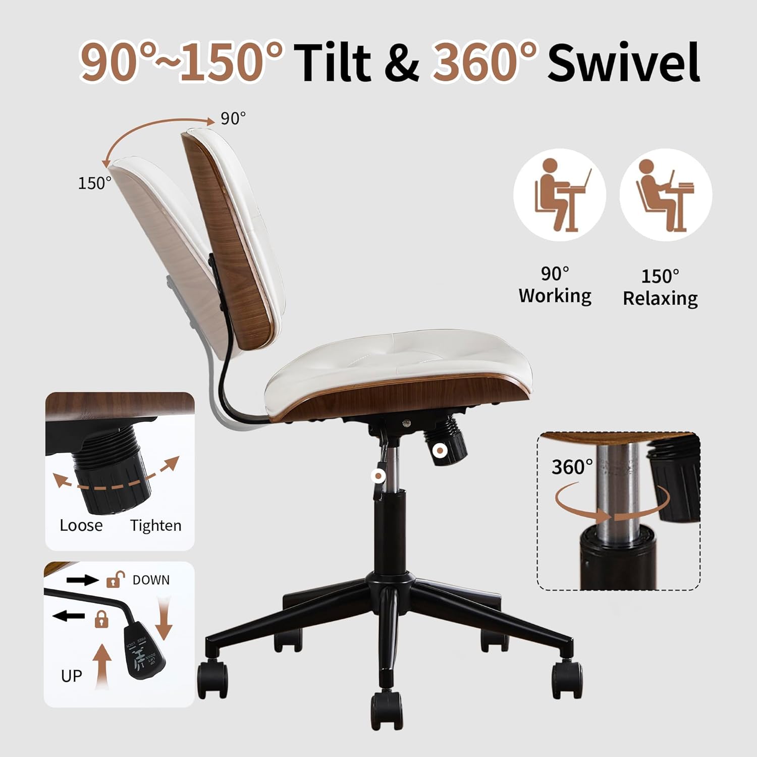 - 360°SWIVEL WITH ROCKING FUNCTION : This armless office chair features a 360° swivel and swing function that allows you to tilt comfortably by pulling out the locking lever to find your ideal position within a 90-135° swing range, Secure with the tilt tension control knob. It also features an adjustable height range of 19.3 inches to 23.3 inches to accommodate a variety of desk heights, ensuring you find the most comfortable seating position. An ergonomic chair for unrivaled enjoyment!