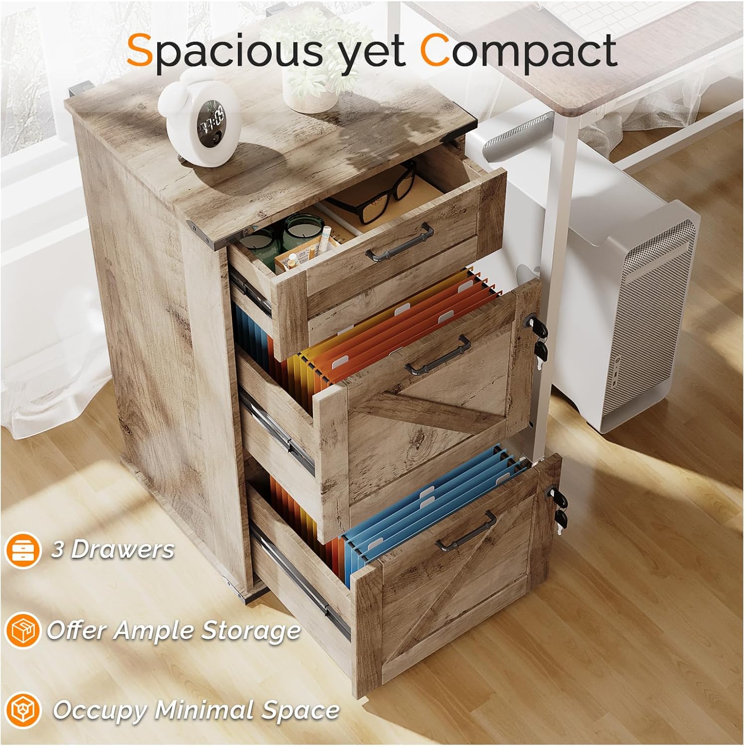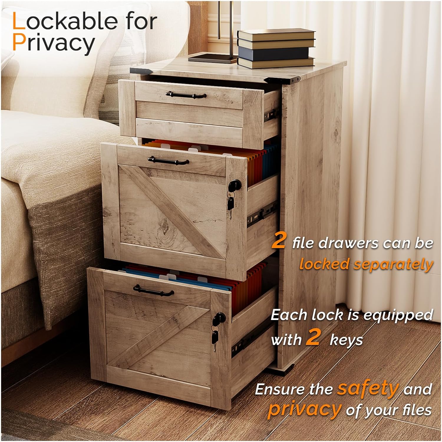 VINGLI 3 Drawer File Cabinet with Lock, Home Office Filing Organizer, for Letter Size File Folder Storage, Modern Farmhouse Style, Wood Vertical Filing Cabinet, Archivador (Rustic Gray)