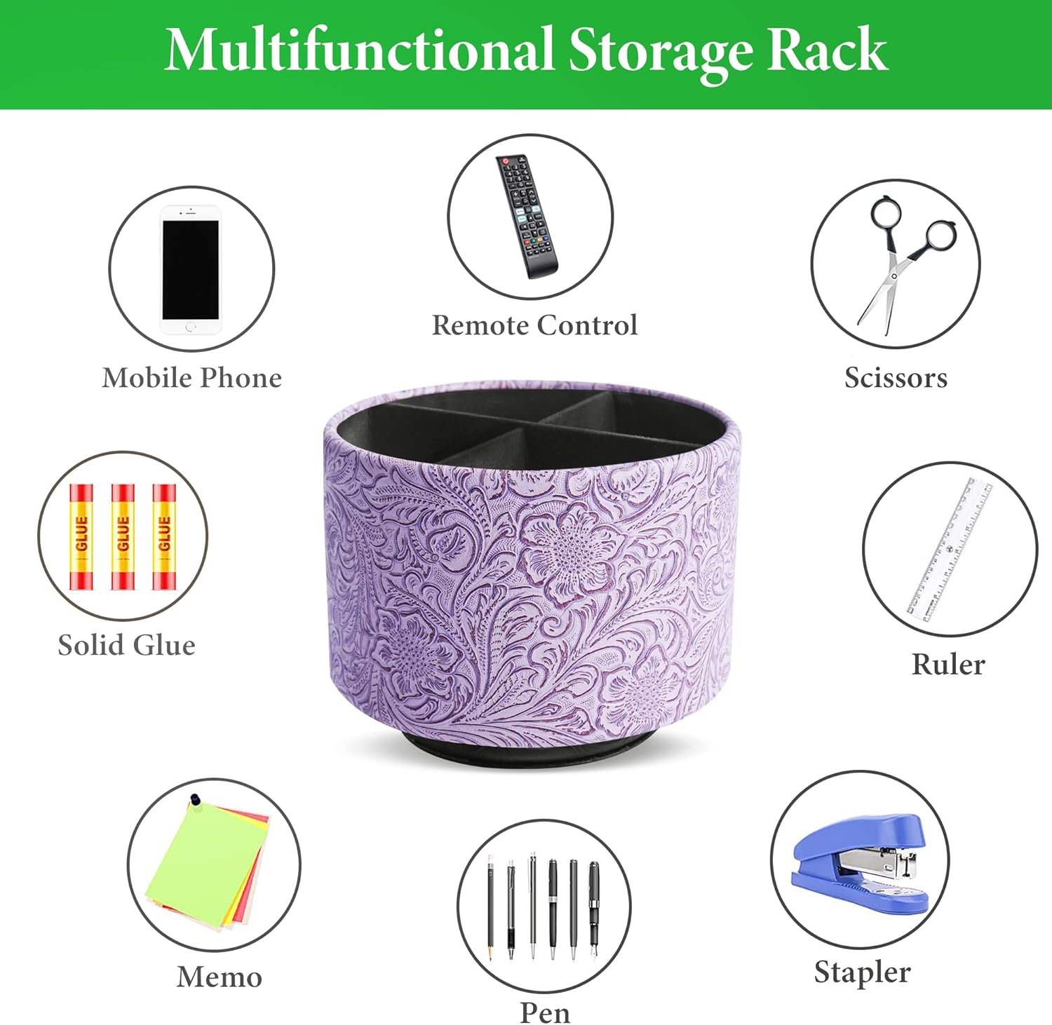 lizimandu Round Leather Art Supply Organizer,Remote Control Holder,360 Degree Spinning,Multi-Functional Pencil Holder,4 Compartments Desktop Stationary Organizer(1-Carved Puple)