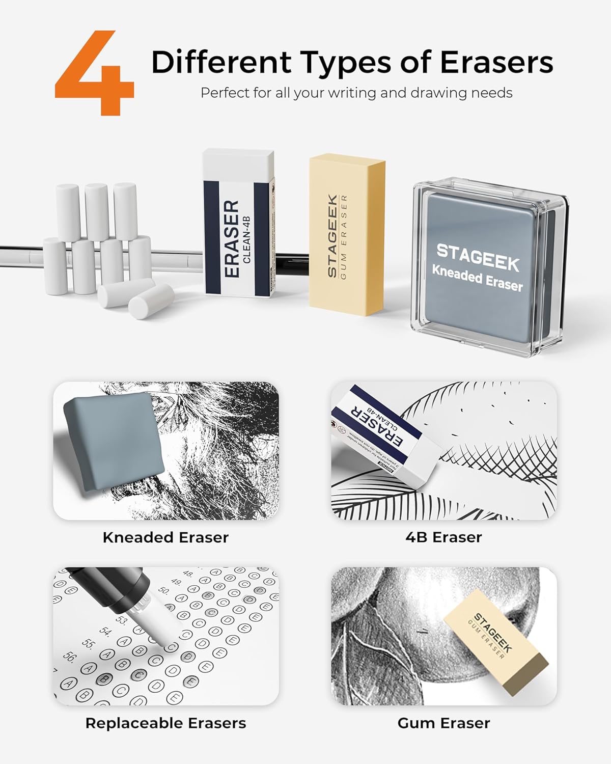 - Mechanical Pencil Set: The pencil set includes 1 premium 4B eraser, 1 kneaded eraser, and 1 tube of eraser refills (9 pieces) for clean corrections. A double-hole lead sharpener is included for versatile tip maintenance, while the 2.0mm pencil cap features a built-in sharpener for quick adjustments