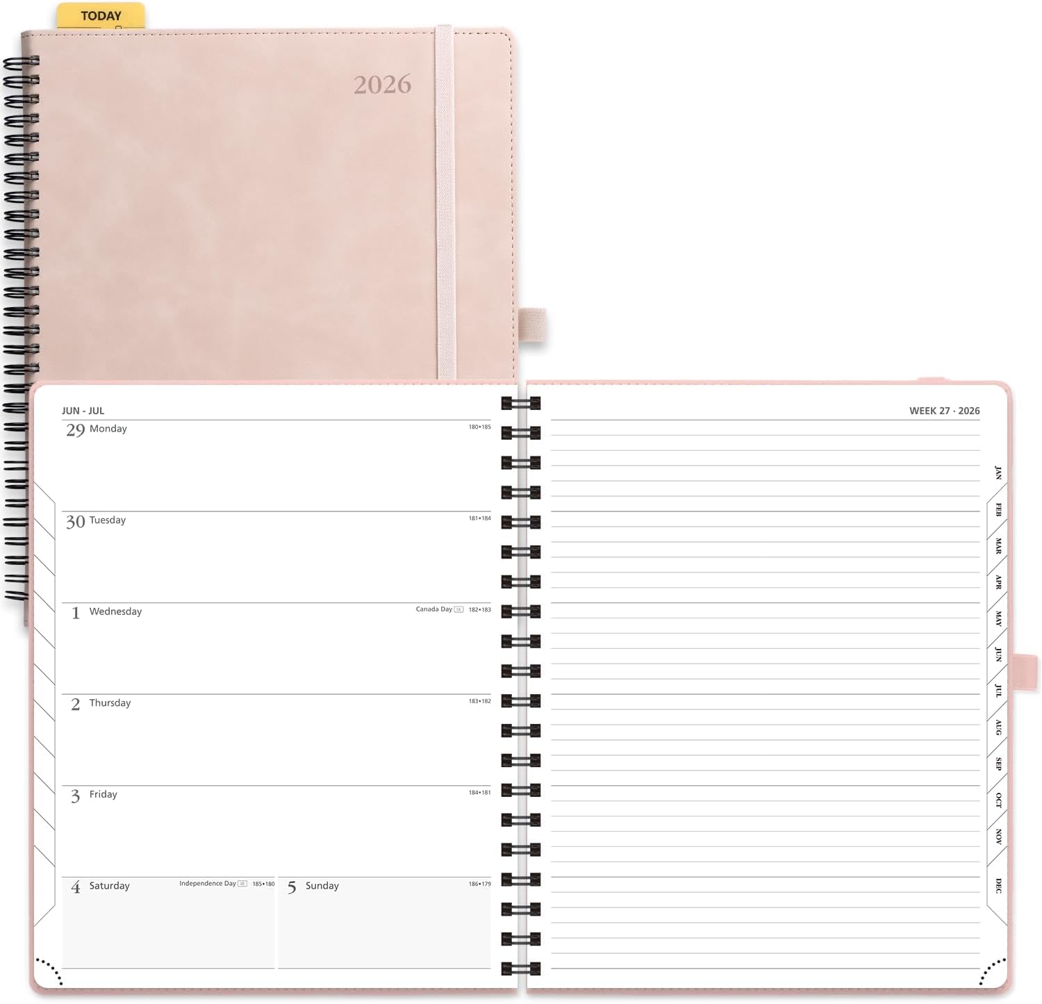 POPRUN 2026 Planner Weekly Notebook Calendar (Jan-Dec), Large Size 8.5'' x 10.5'' - Agenda 2026 Appointment Book with Monthly Tabs, Inner Pocket, Spiral Soft Cover, 100 GSM - Soft Pink