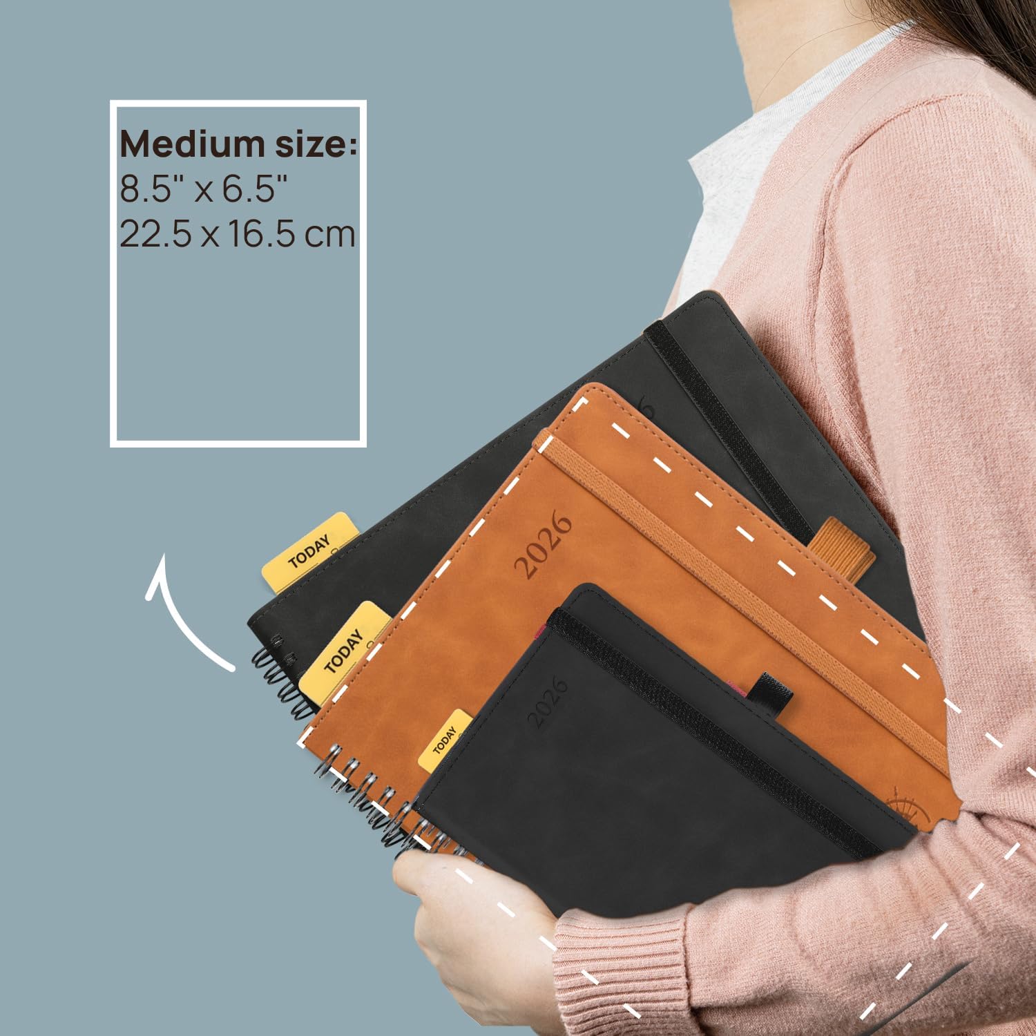 POPRUN 2026 Planner Weekly Notebook (Jan-Dec), Medium 8.5''x 6.5'' - Agenda 2026 Calendar Book with Monthly Tabs, Inner Pocket, Spiral Soft Cover, 100 GSM - Brown