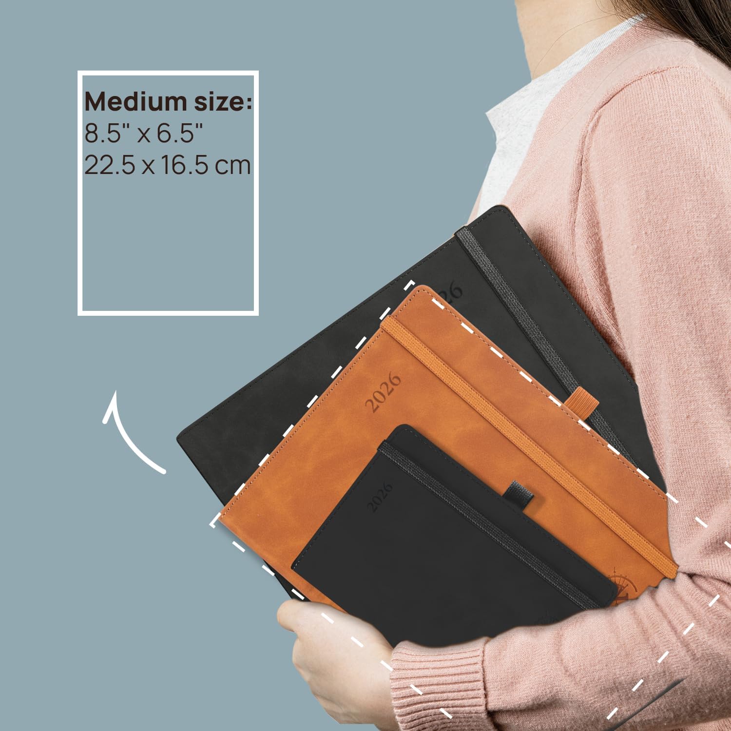 POPRUN Weekly Planner 2026 (Medium 6.5" x 8.5") Calendar 12 Months Notebook with Horizontal Layout, Leather Soft Cover, Monthly Tabs, Inner Pocket, 100GSM Thick Paper, Pen Holder - Brown