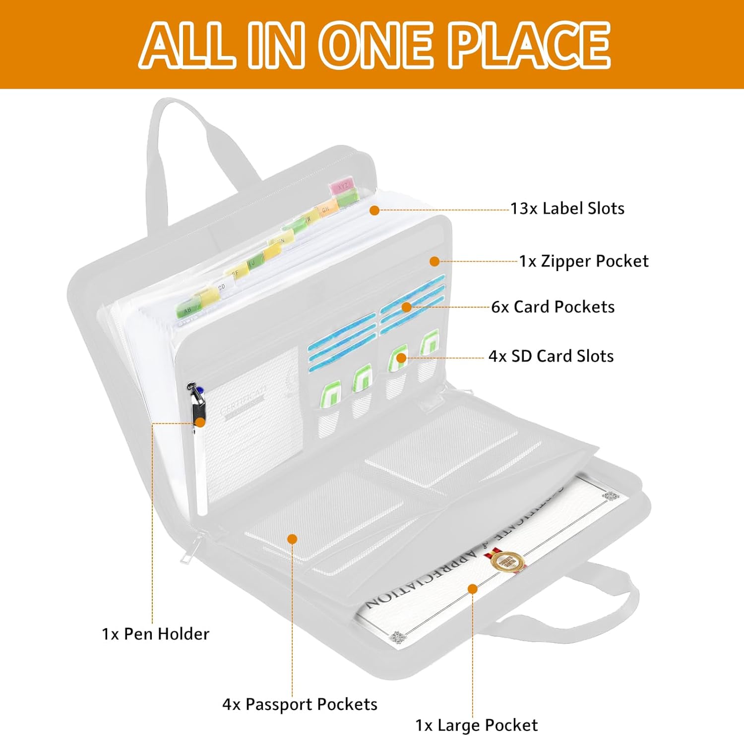 File Organizer Fireproof Expanding Accordion File Folder with Zipper Labels13 Pockets Document Organizer Holder Storage Box Bag for Business Office Receipt Home Travel
