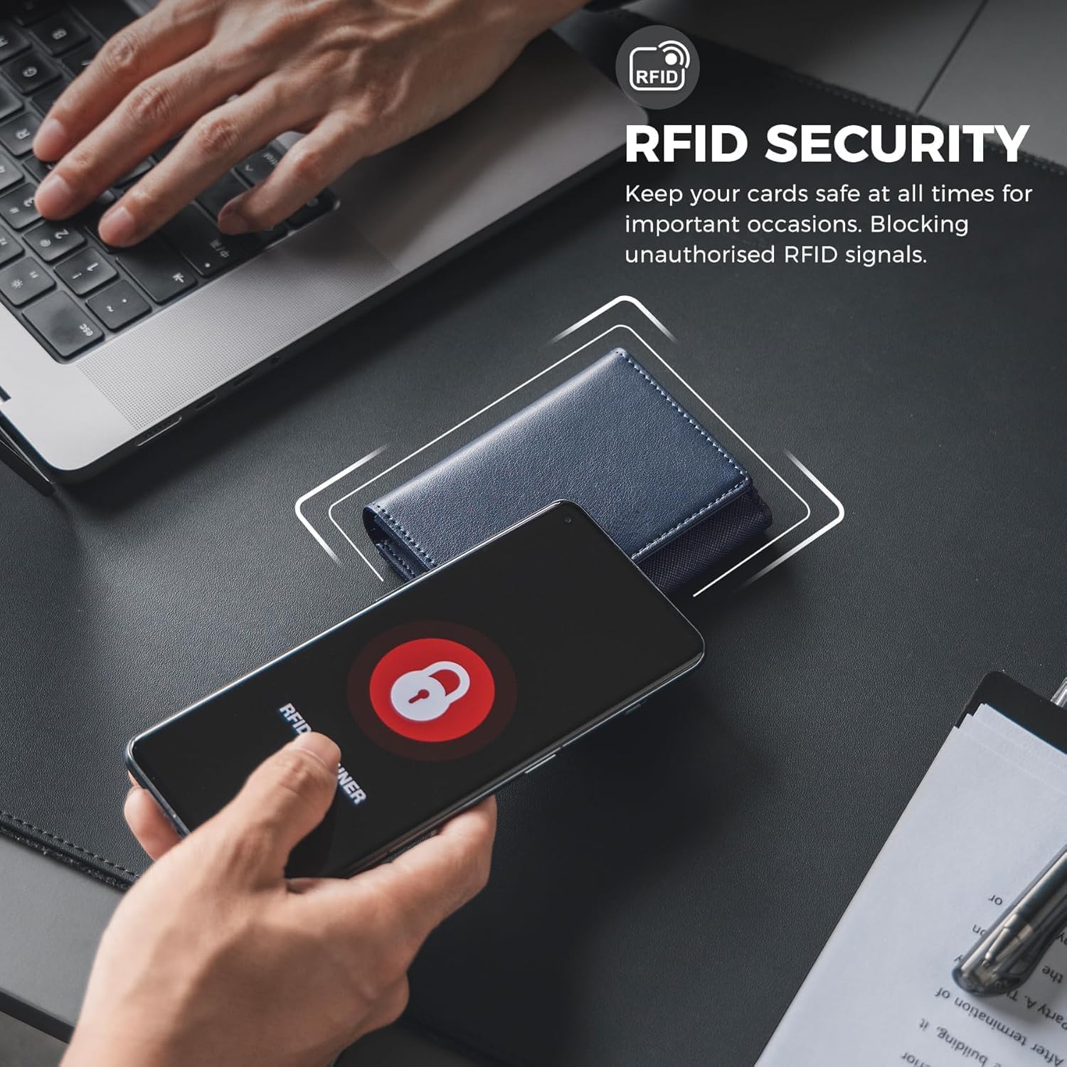 Real Leather Business Card Holder Premium RFID Blocking Card Case with ID Window and Magnetic Closure Holds Up to 40 Business Cards (Navy)
