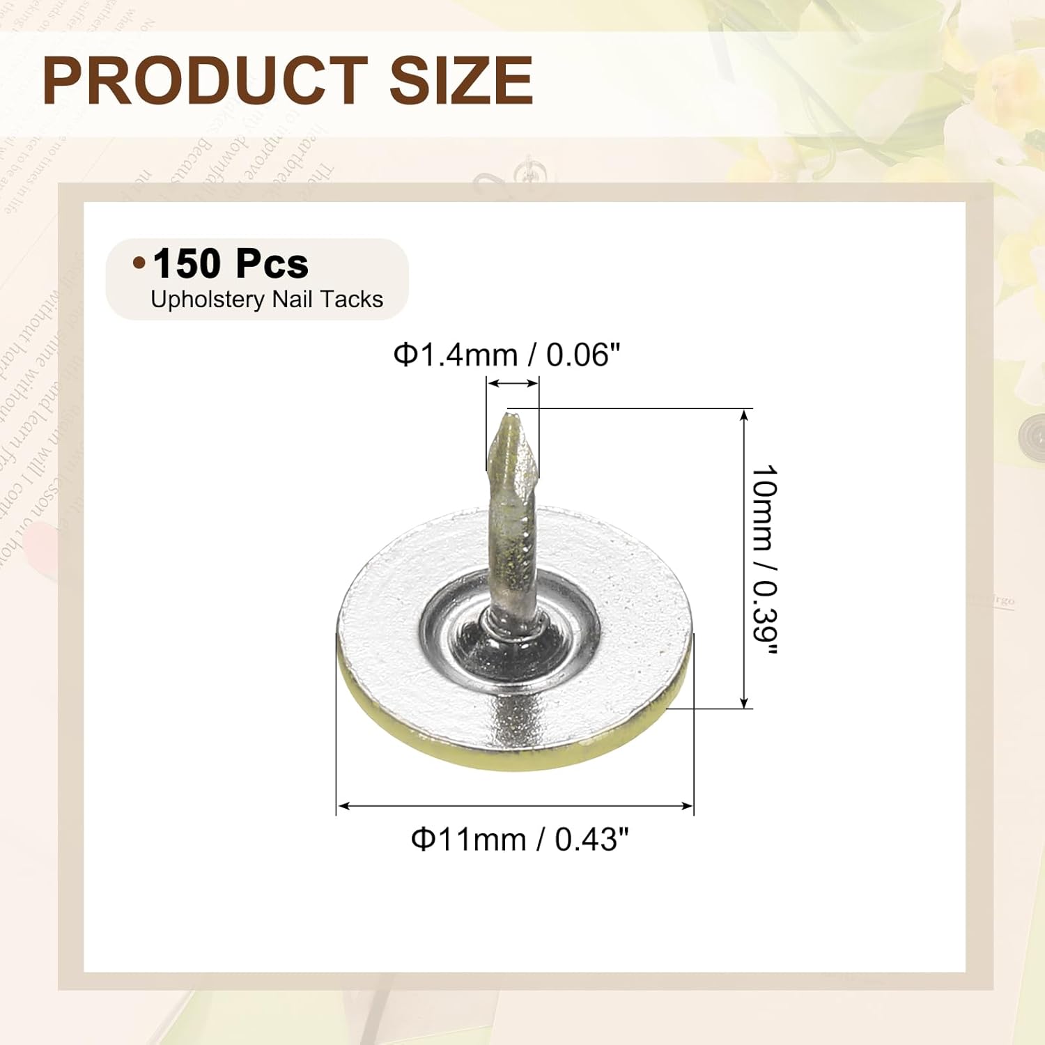 - [Size & Quantity] - The package comes with 150pcs decorative upholstery tacks. Sufficient quantity to meet your different daily needs. The overall size of upholstery nails is about 11mm x 10mm/0.43-inch x 0.39-inch(D*H)