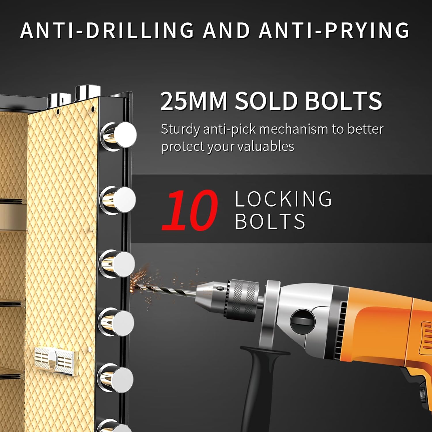 - 【ANTI-BURGLARY ALARM SECURITY SAFE】: This digital anti-burglary safe is equipped with an advanced anti-tampering and motion-sensing alarm system to keep your belongings safe. If five fingerprint input errors or three password input errors, the system will automatically trigger the alarm and lock the panel, which cannot be operated for 180 seconds. After unlocking, any wrong input will trigger the alarm and lock again, further enhancing security. Its deep water drip groove design and sturdy sealed solid steel body with 10 live bolts and double anti-impact hinges effectively prevents break-ins and ensures that your valuables are protected in every way.