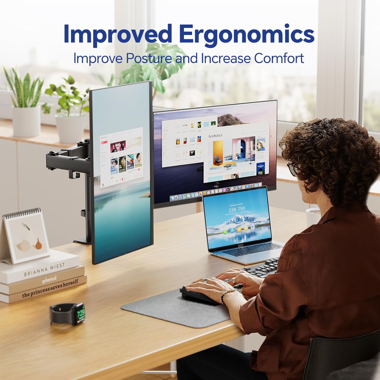 - Articulation & Height Adjustment: Adjustable brackets offer +90° to -90° tilt, 180° swivel, 360° rotation, and height adjustment along the center pole. The monitor can be placed in portrait or landscape mode to find the best position for you.