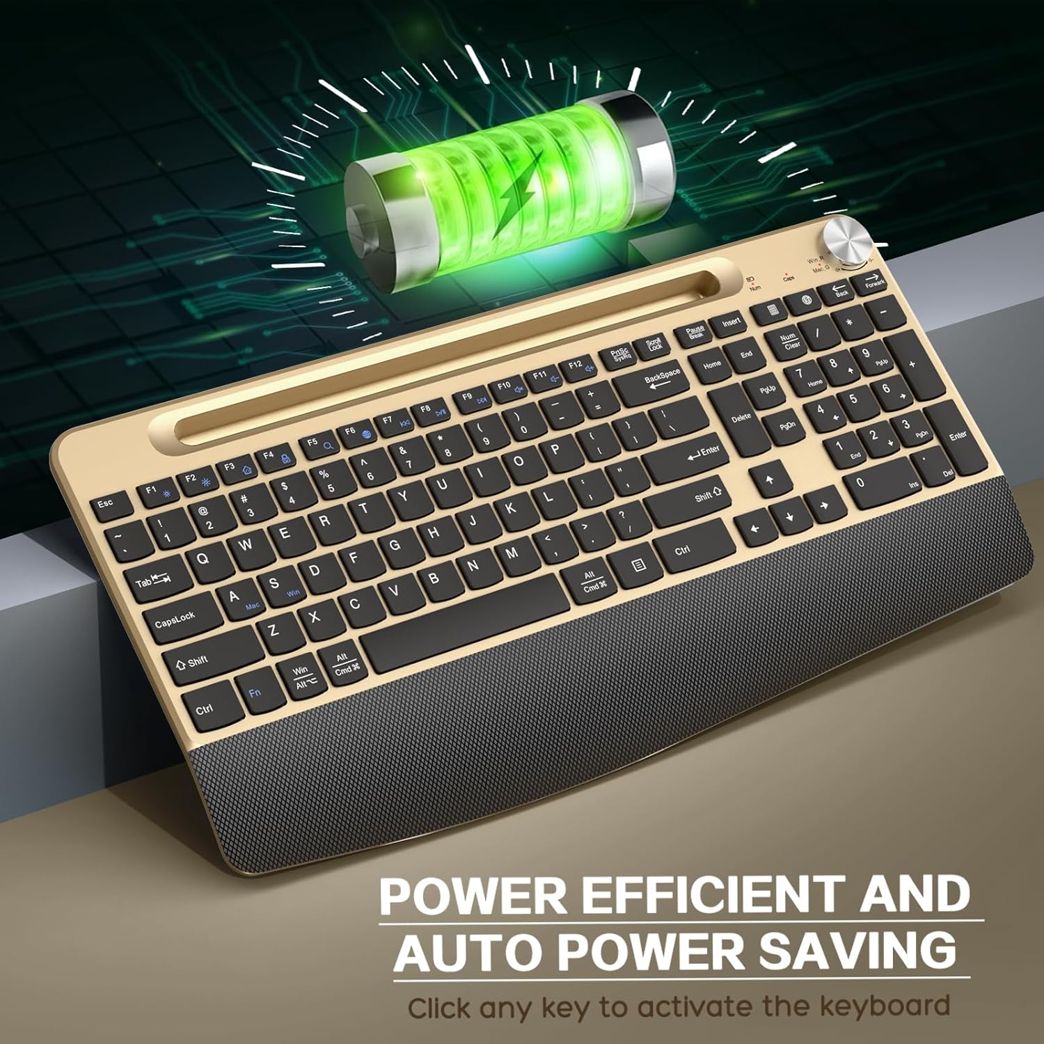 - 【Full-Size Keyboard With Phone Holder】The full-size gold wireless keyboard is designed with a phone and tablet holder. Provides you with additional space to place your phone, tablet, or other gadgets,never miss anything important messages again.You can work by using a laptop when placing a phone or tablet, or watching videos while working.(Note: Keyboard only hold the devices,not work with them.)