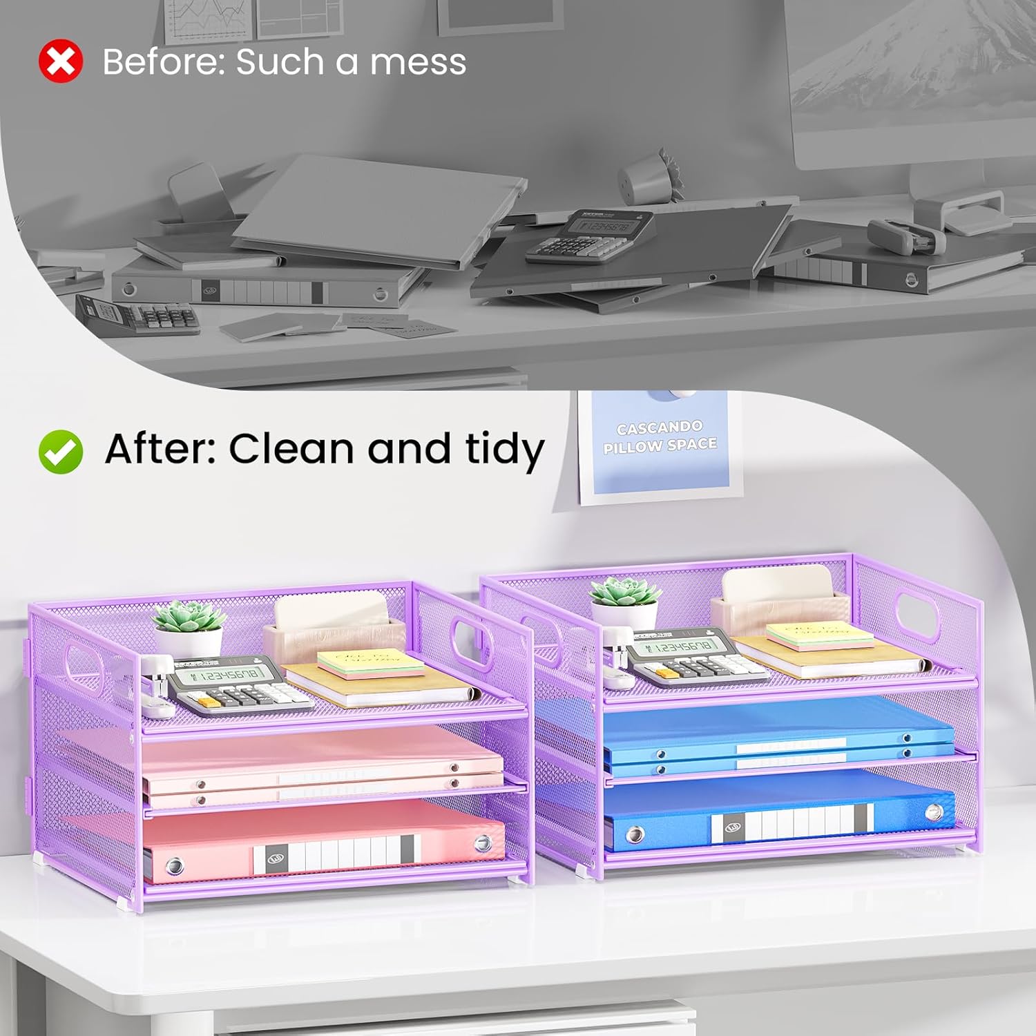 Subekyu 2-Pack 3-Tier Purple Metal Mesh Desk Paper Letter Tray & File Sorter Organizer with Handle + 1 Sliding Tray for Desk, Home, Office, School Supplies, A4 Paper and Accessories Storage