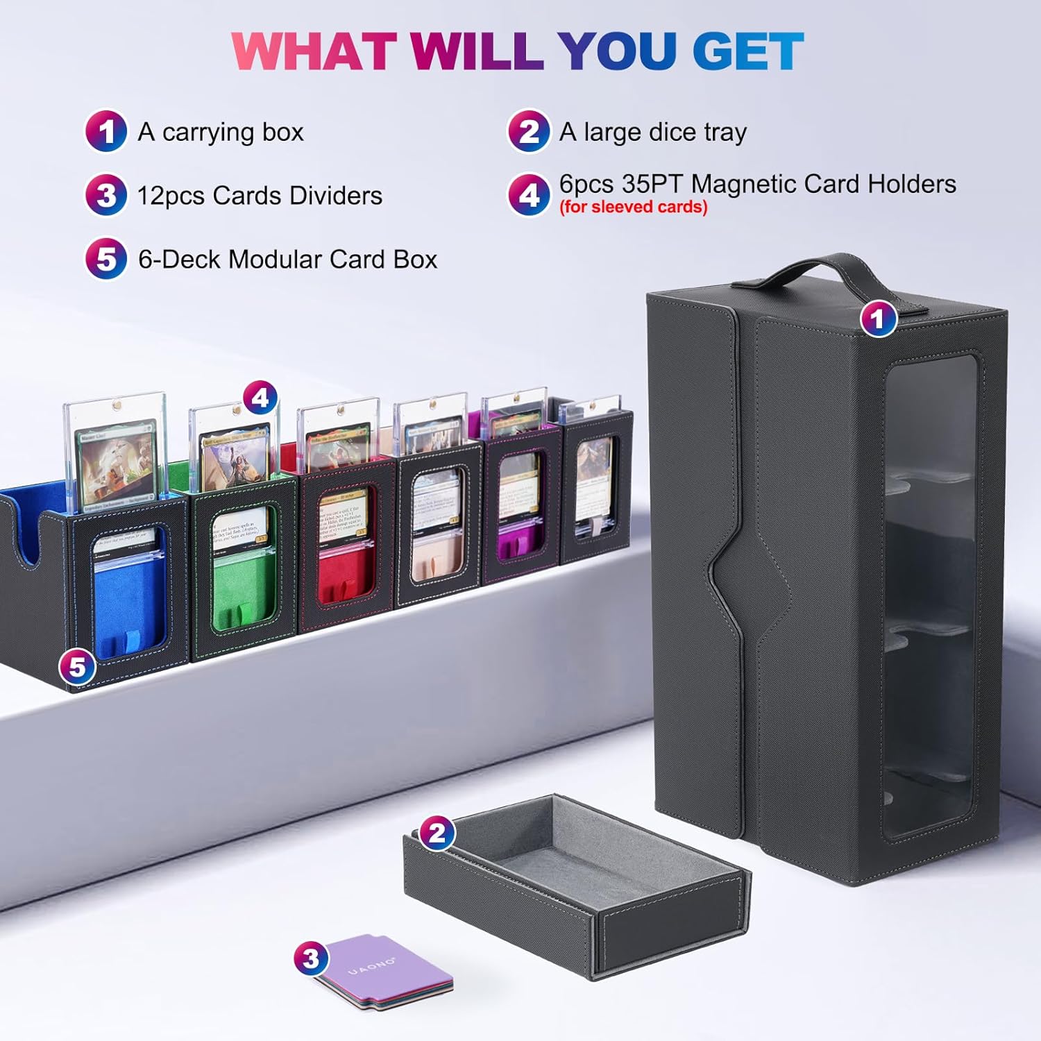 Commander Deck Box for MTG, 6-Deck Modular Card Case with Dice Tray Hold 600+ Double-sleeved Cards, Removable Trading Cards Storage Box with 35PT Magnetic Card Holders for TCG, Multicolour