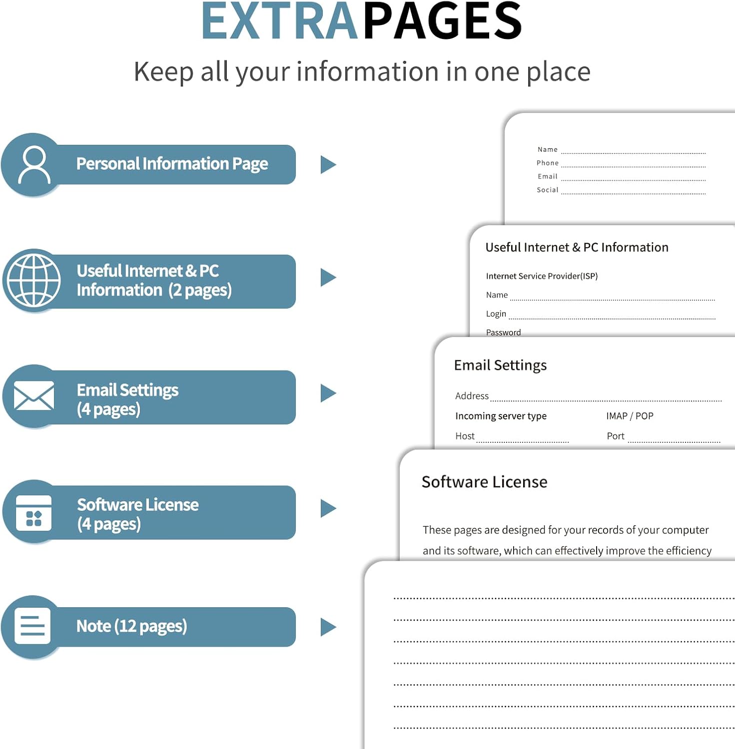 - 【Plenty of Space for Information】Our small pocket password book with 4 entries per page, and it can contain over 552 passwords. There are additional pages: Useful Internet & PC Information (2 pages), Email Settings(4 pages), Software License(4 pages), and Notes(12 pages). We have reserved a place to write a password hint instead of the password itself to ensure password security.