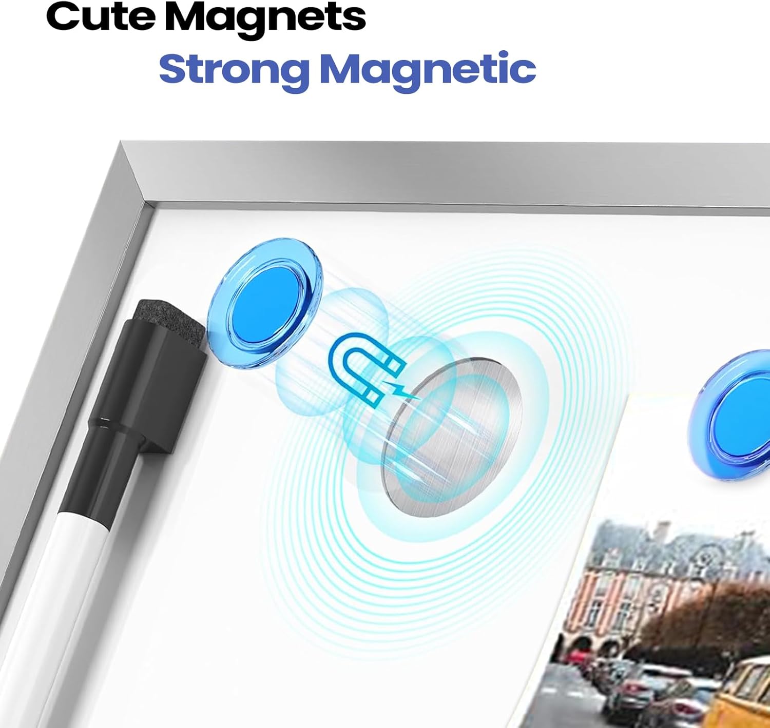 - Versatile & Portable Small Whiteboard – This 10” x 10” magnetic dry erase board features silver frame and reinforced corners for added durability. Lightweight yet sturdy, it includes a metal stand for easy use on the desktop