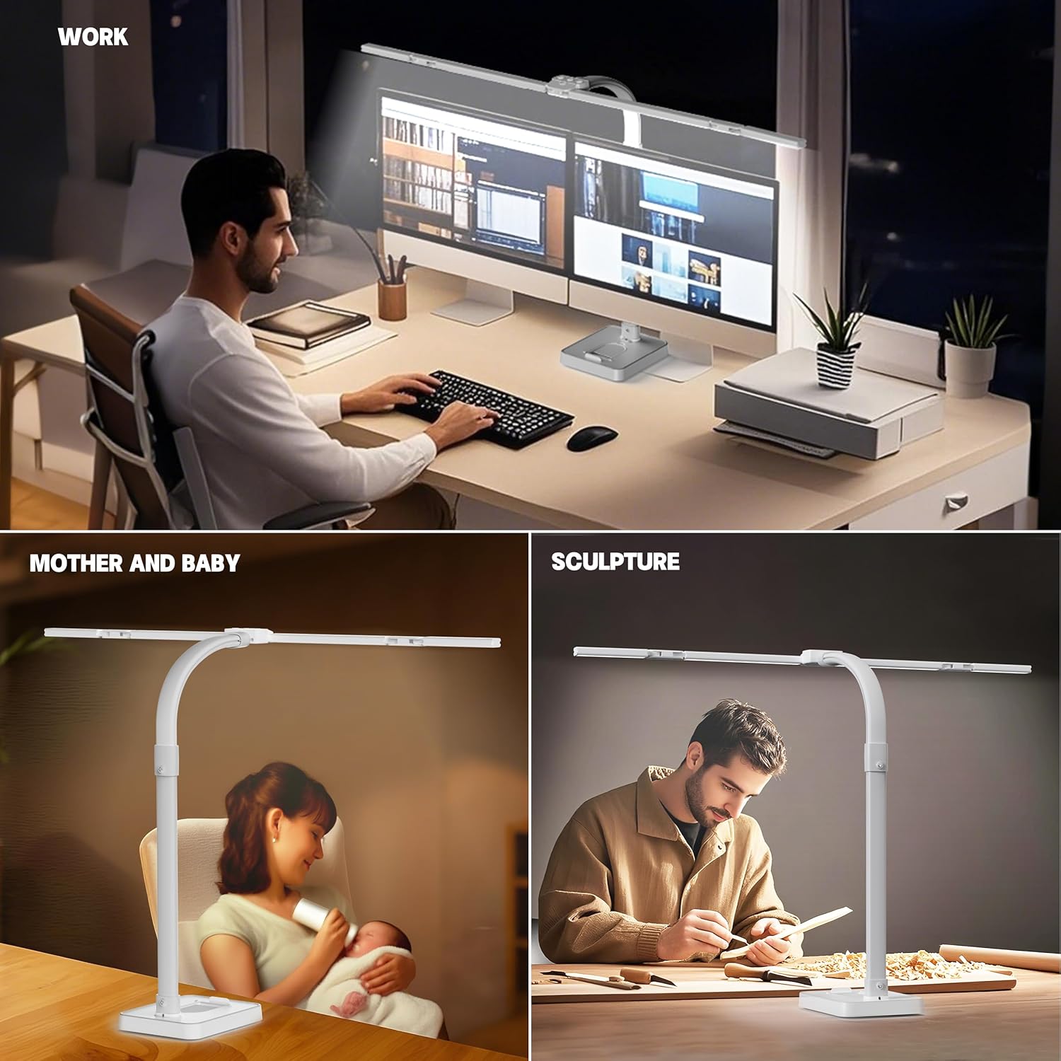 LED Desk Lamp for Home Office - 24W Bright Double Head Desk Light with Clamp Eye Caring Architect Task Light 25 Lighting Modes Adjustable Flexible Gooseneck Lamp (All White)