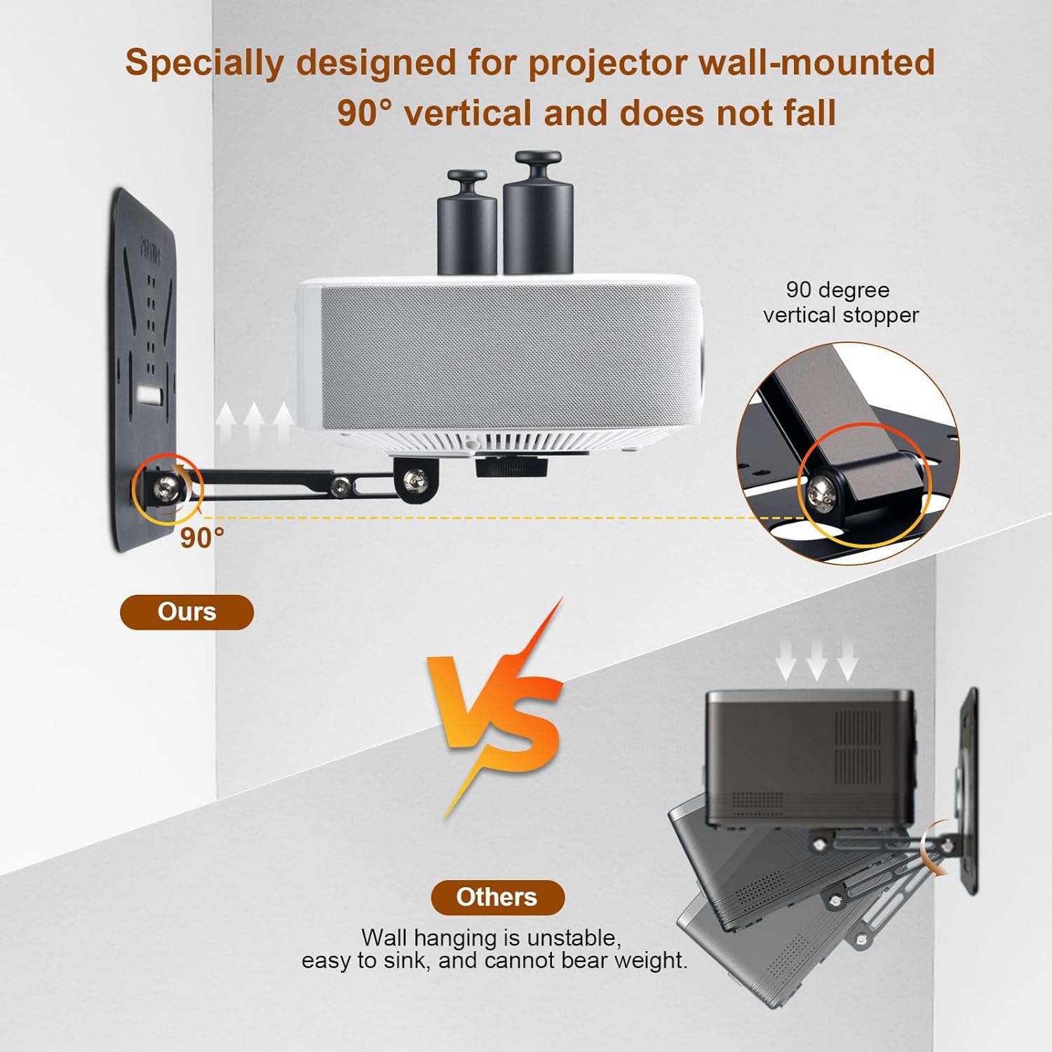 - 3-in-1 Projector Wall & Ceiling Mount – Featuring an exclusive 90-degree vertical limiter design, this projector mount ensures your projector stays original state in place even after prolonged wall mounting. It solves the common issues of projector wall mounts failing to support projectors over 2kg (4.4 lbs) on walls or gradual misalignment over time.
