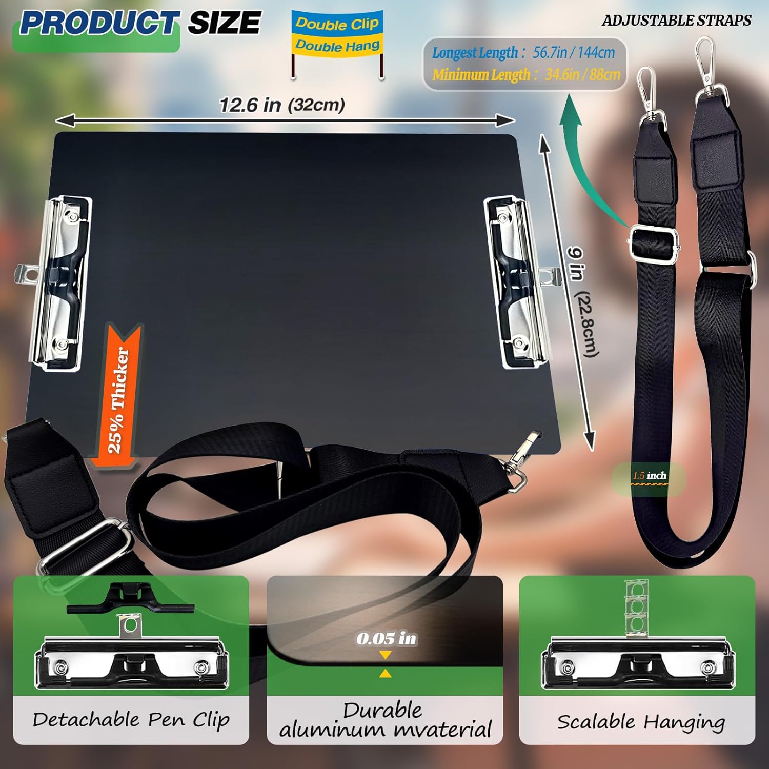 - 【Portable A4 Size】: Size: 9 × 12.6 Inch metal clipboard, Perfect for A4, letter size (8.5 in × 11 in) or downsize paper sheets documents. Shoulder strap adjusted maximum length 57 inches, suitable for a wider range of body types and usage scenarios.