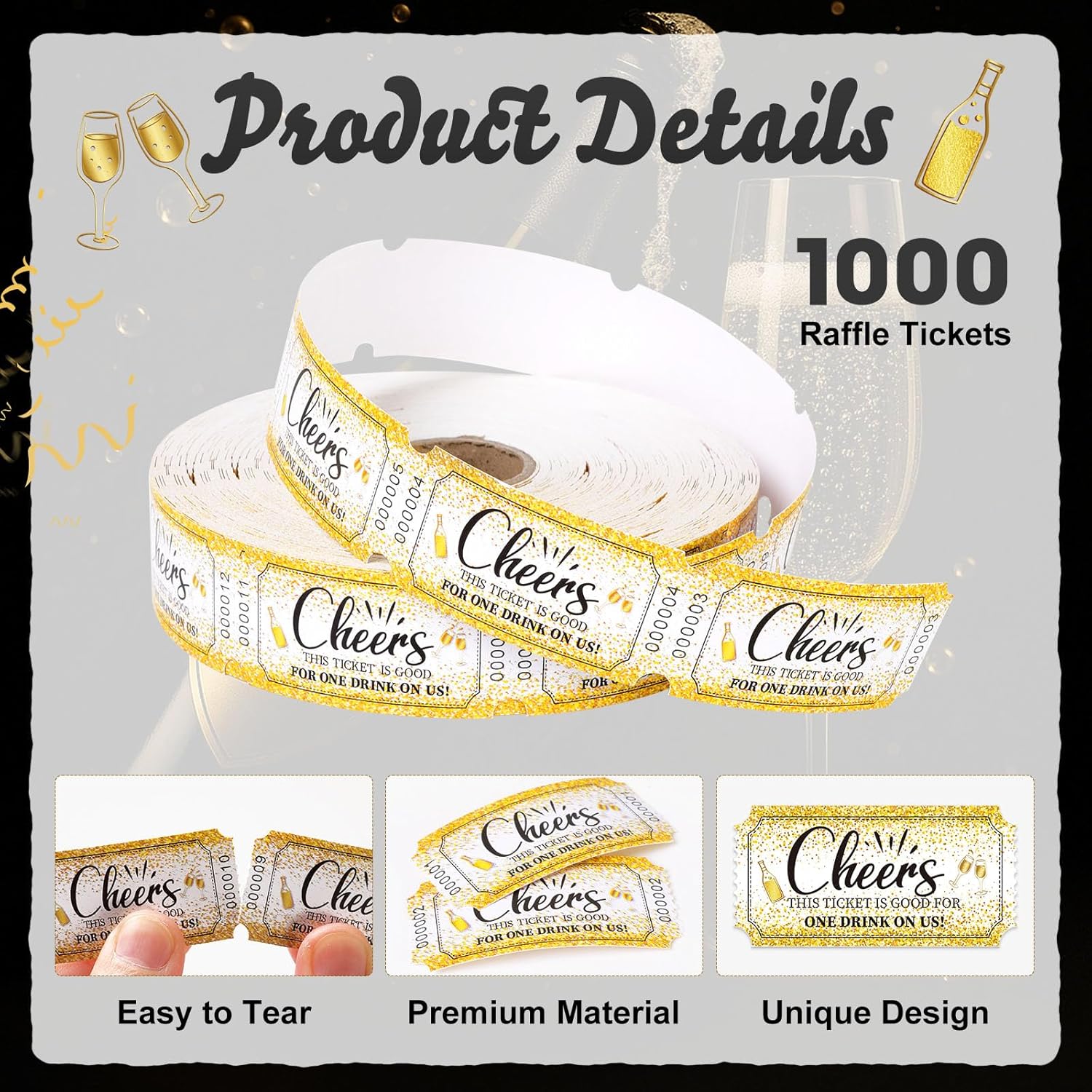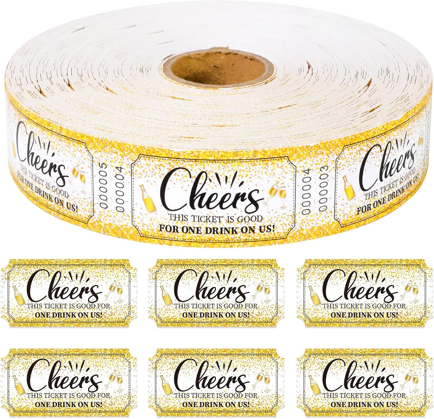 1000 Pcs Drink Ticket Single Raffle Tickets Roll Golden Sequins Cocktail Design Cheers Free Drink Ticket for Events Wedding Work Formal Parties Leisure Class Reward