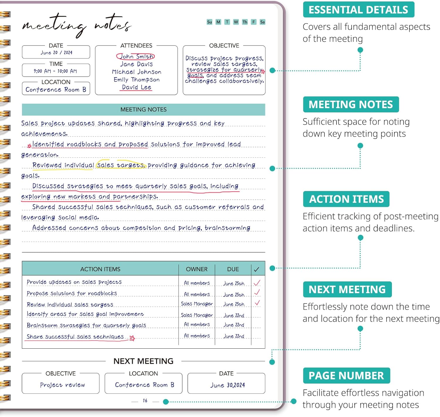 - Boost Meeting Efficiency: A meeting notebook helps you manage and streamline meeting details, ensuring discussions, decisions, and action items are accurately captured and organized. It promotes a more efficient workflow, allowing for easy reference and retrieval of information during and after the meeting.