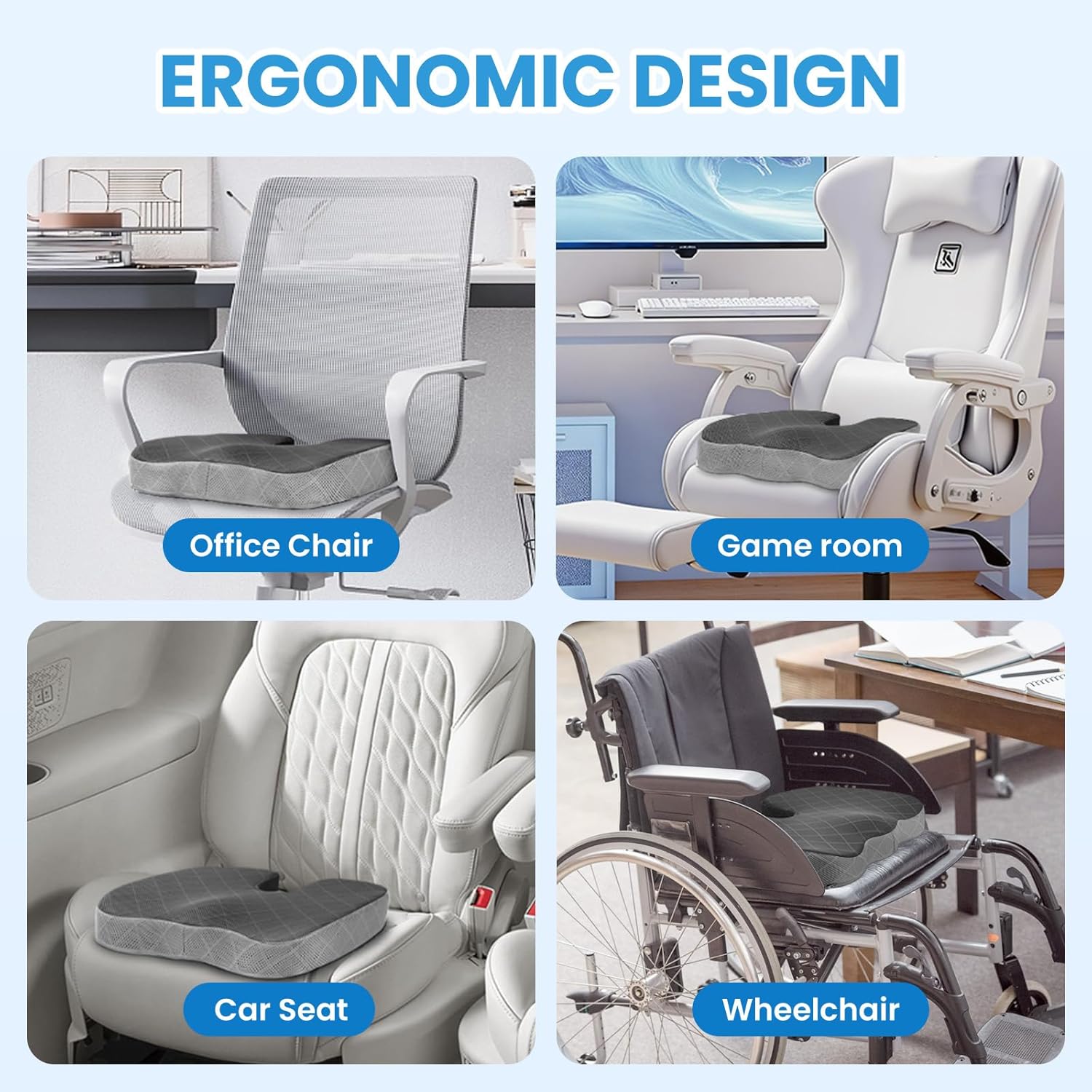 - 【Multiple Uses】This office chair cushion fits all types of chairs, great for office chair, car seat, airplane seat, gaming chairs, bleacher, wheelchairs. Comfortable for business travel, sporting events, or elderly