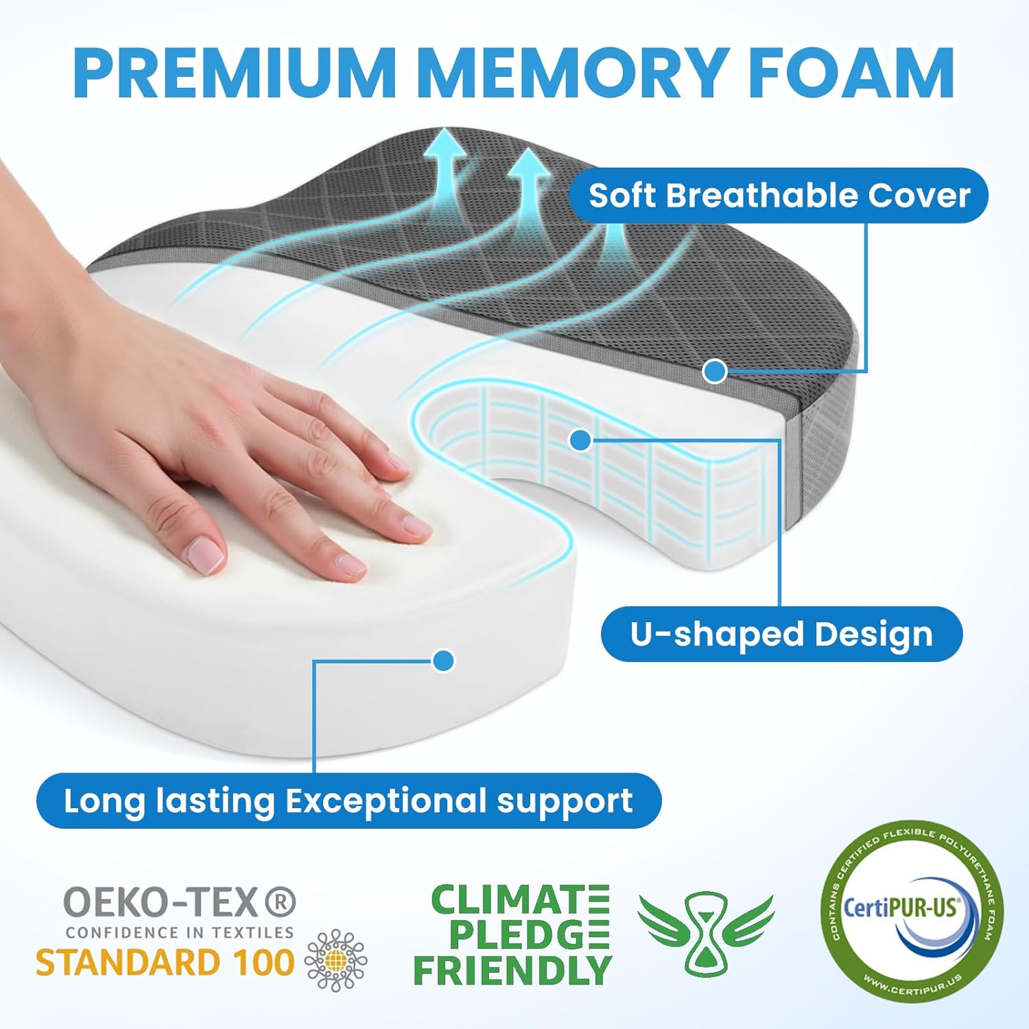 - 【Premium Memory Foam】Our office chair seat cushion is made of 100% pure memory foam, soft and firm, uses your own body heat to adapt to your curves, ergonomic "U" shaped hollow design for superior comfort, effectively support the coccyx, relieve the hip pressure caused by sitting for long periods