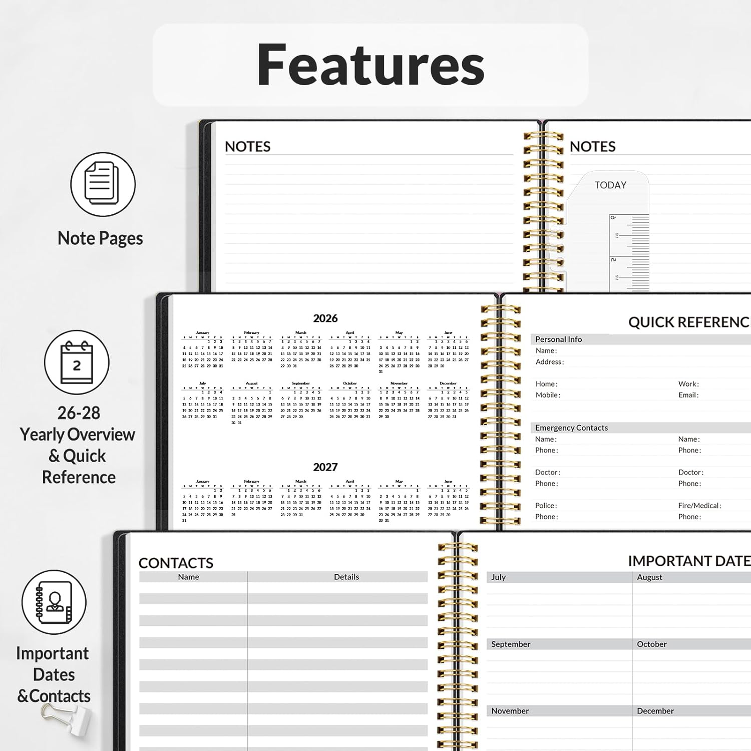 - Additional Features - The weekly planner includes 2026-2028 calendars, year schedule for full year 2026, holiday lists, contact pages, notes pages, important dates, and US time zone map. Rainbow monthly tabs simplify navigation and add a stylish, playful element to the planner's aesthetic.