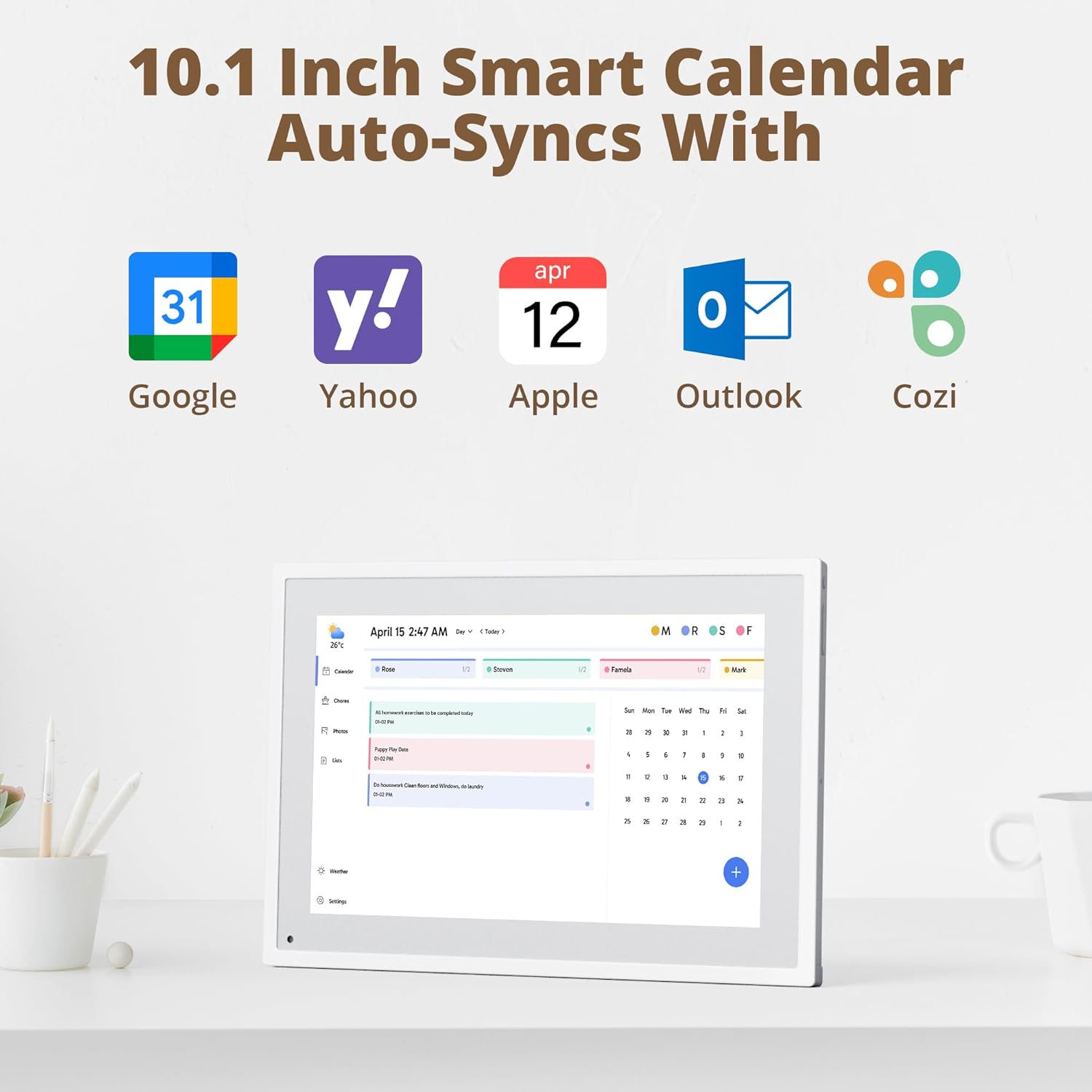 - 【Charming Digital Picture Frame】: When not in use, your smart calendar transforms into a beautiful digital picture frame. Showcase treasured family photos on the crystal-clear 10.1" large touchscreen, adding a touch of elegance to any room as modern home decor.