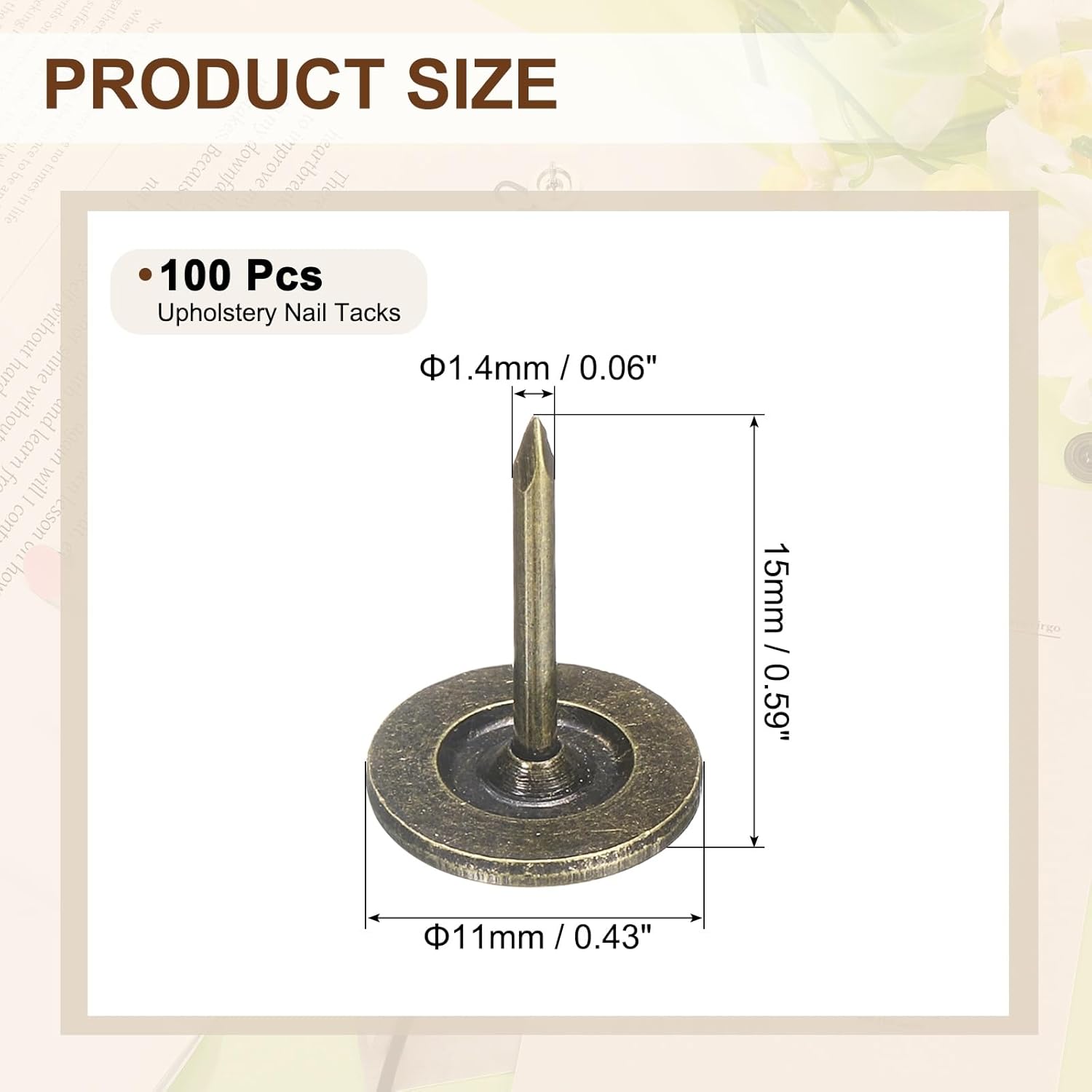 - [Size & Quantity] - The package comes with 100pcs decorative upholstery tacks. Sufficient quantity to meet your different daily needs. The overall size of upholstery nails is about 11mm x 15mm/0.43-inch x 0.59-inch(D*H)