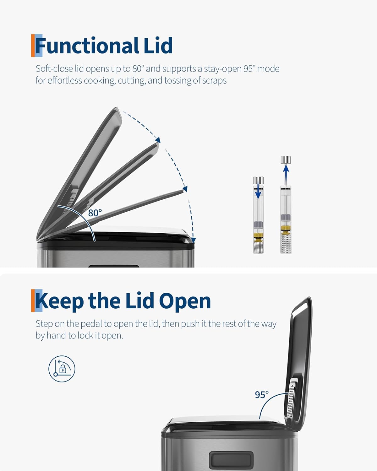 - [PRACTICAL DESIGN] – GarveeHome’s dual trash and recycling bins put ease of use first. Ergonomic side handles let you lift and relocate the entire unit effortlessly. The soft-close lid opens to 80° without collision with standard kitchen island edges, and locks at 95° for hands-free cooking prep and scrap disposal. Dual inner buckets with weighted-edge lids trap odors separately. A custom liner ring secures any standard bag snugly, eliminating slips, bunching, and overhang