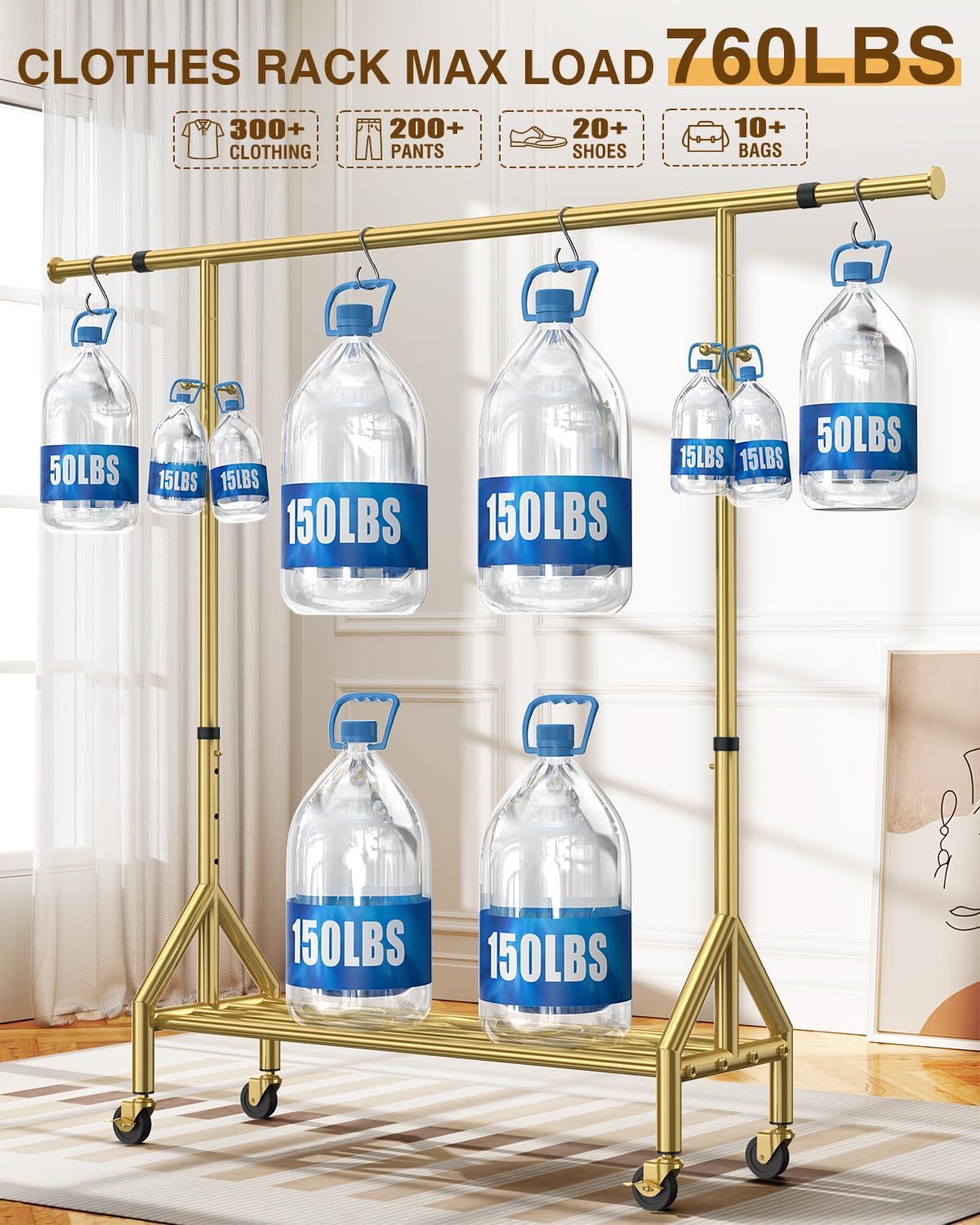 - 100% STAINLESS STEEL STRENGTH - ENJOY 760 LBS & RUST-DEFYING! Boasting an industry-leading 760 lbs weight capacity, 50% stronger than competitors, our NEWEST clothes rack confidently handles your heaviest garments. It features 100% stainless steel design, with even the smallest screws made of the same high-quality material. We've implemented a cutting-edge five-layer coating process, including an extra protective sealant layer, ensuring your rack remains rust-free and resistant to wear and tear.