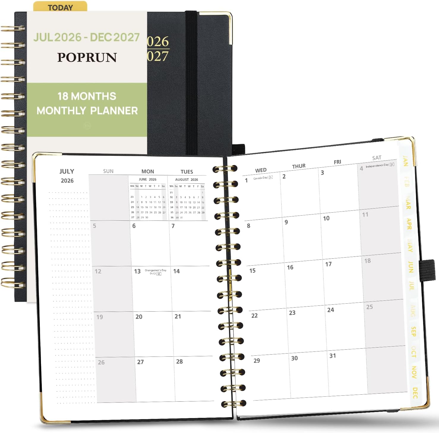 POPRUN Monthly Planner 2026-2027 Spiral Hardcover (6.25'' x 8.5''), 18 Months Calendar (Jan.2026-Jun.2027) - 2 Pages per Month with Dotted Note Pages, Sunday Start, Laminated Tab - Black