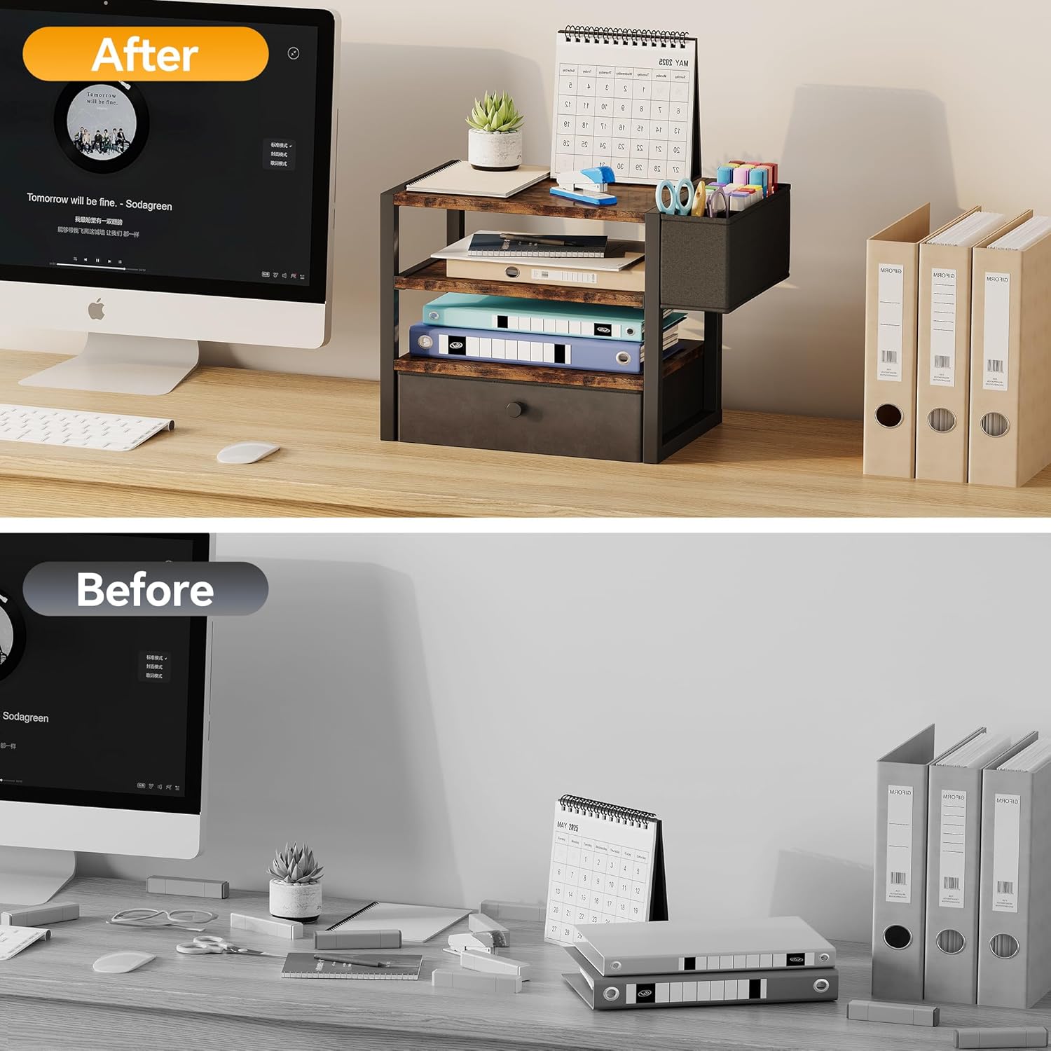 - 【Stylish Desktop Storage Solution】This desktop organizer features 3-tier wooden trays (the middle one slides) with a fabric drawer and three pen holders, offering generous storage for all your office supplies and desk accessories while maintaining an orderly workspace.